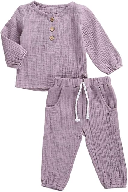 Karuedoo Toddler Baby Boy Girl Cotton Linen Pants Set Solid Long Sleeve T Shirt Top Drawstring Elastic Waist Pants Outfit