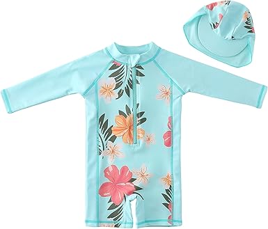 Baby Girl Beach Swimwear Long Sleeve Rashguard UPF 50+ -Sun Protective Sunsuit with Hat