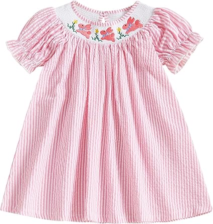 Aopwsrlyi Toddler Baby Girl Easter Outfit Cute Bunny Embroidery Smocked Bubble Romper Dress Puff Short Sleeves Bodysuit