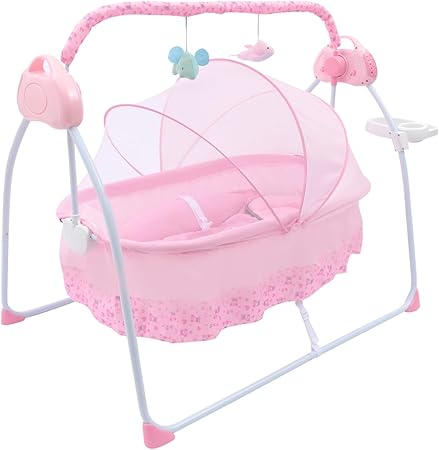 Electric Baby Cradle Swing, Foldable Baby Crib Cradle Bluetooth Auto-Swing Baby Cradle Crib with Remote Control & Music Adjustable 5 Speed Infant Rocking Chair Bed 55LBS Capacity for 0-18 Months Pink