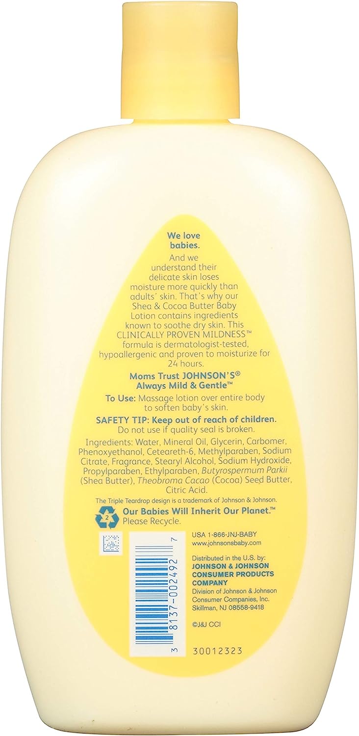 This unique lotion combines shea and cocoa butters, ingredients long known to soothe and relieve dry skin, with hydrating emollients, to help maintain skin's natural moisture for 24 hours. Nongreasy and fast absorbing, this creamy lotion nourishes and conditions baby's skin, leaving it feeling soft and smooth. Johnson's Shea & Cocoa Butter Lotion is allergytested, and clinically proven mild, so it can be used on all skin types. Use every day for baby soft skin.