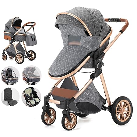 2 in 1 Travel Stroller, Baby Stroller Travel Systems with Portable Quick One-button Fold Aluminum Frame, Newborn Stroller with Rain Cover Mosquito Net Stroller Bag