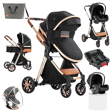 3 in 1 Baby Stroller Travel System Combo Set, Reversible Convertible Infant Stroller with One-Click Folding, Toddler Newborn Pram Carriage with Aluminum Frame (UDV9-BLACKGOLD with Base)