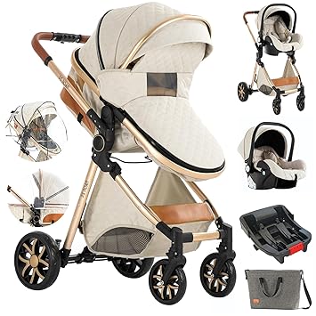 3 in 1 Baby Stroller Travel System Combo Set, Reversible Infant Stroller with One-Click Folding, Convertible Newborn Toddler Pram Carriage with Aluminum Frame (UDV9-WHITE with Base)