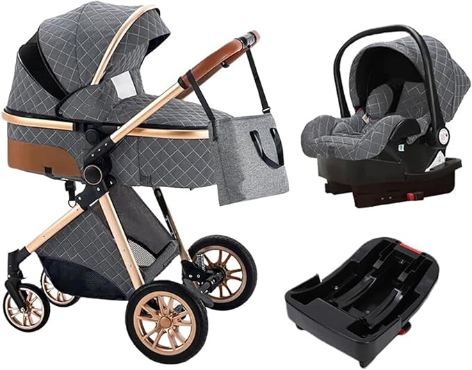 3 in 1 Baby Stroller with Car Seater and Base, Portable Travel System Folding Prams Aluminum Frame High Landscape Baby Carriage, Grey