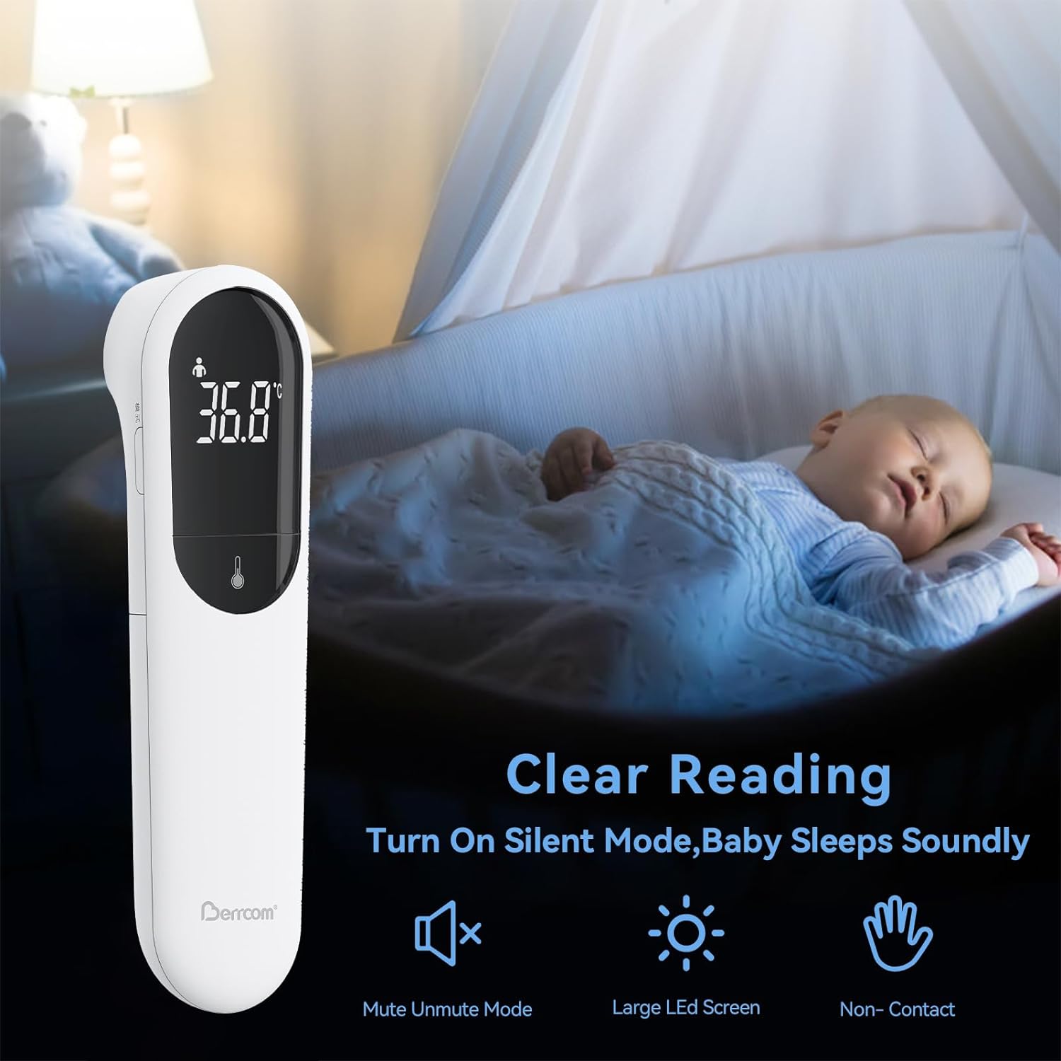 • ★【NON-CONTACT & ONE SECOND INSTANT READING】: Berrcom Non Contact Thermometer can take your forehead/body temperature instantly without physical contact; Suitable for all ages, including adults, infants, children and elders. A great choice for families, nurseries, clinics and schools.