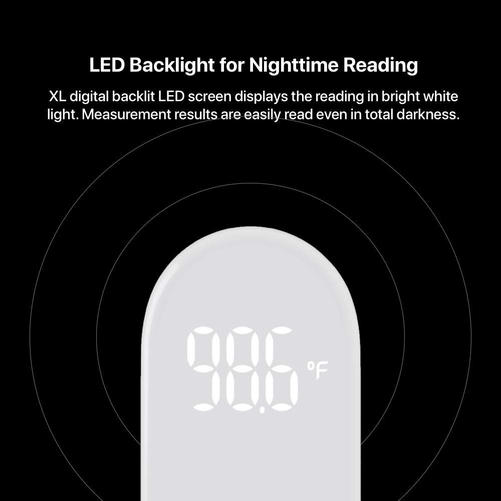 • Simple, Fast, Clear, And Quiet: With an intuitive single-button control design, the thermometer reads and shows the temperature in just one second on its easy-to-read, extra-large LED display, even in total darkness. When the temperature is read, the device gives a gentle vibration notification to the holding hand—no beeps or buzzes.