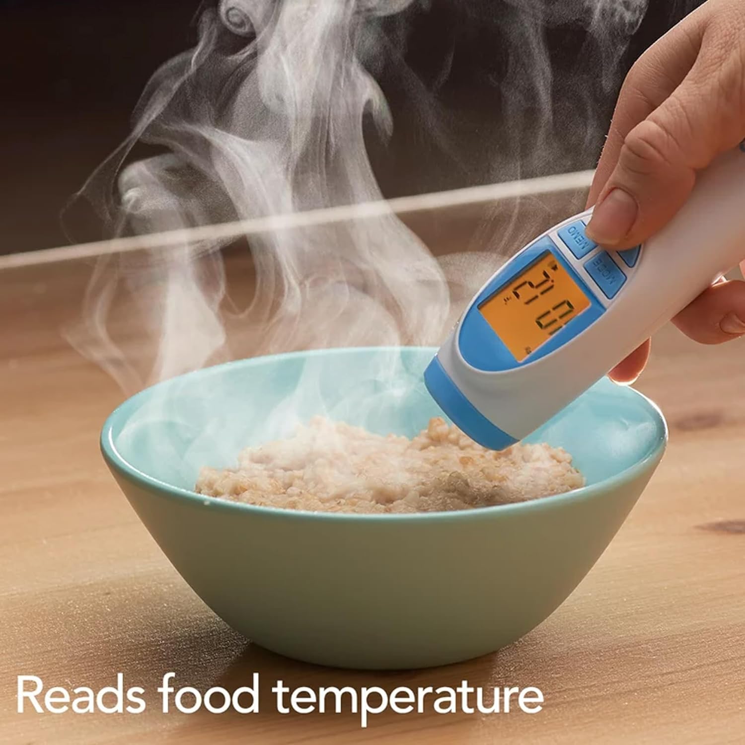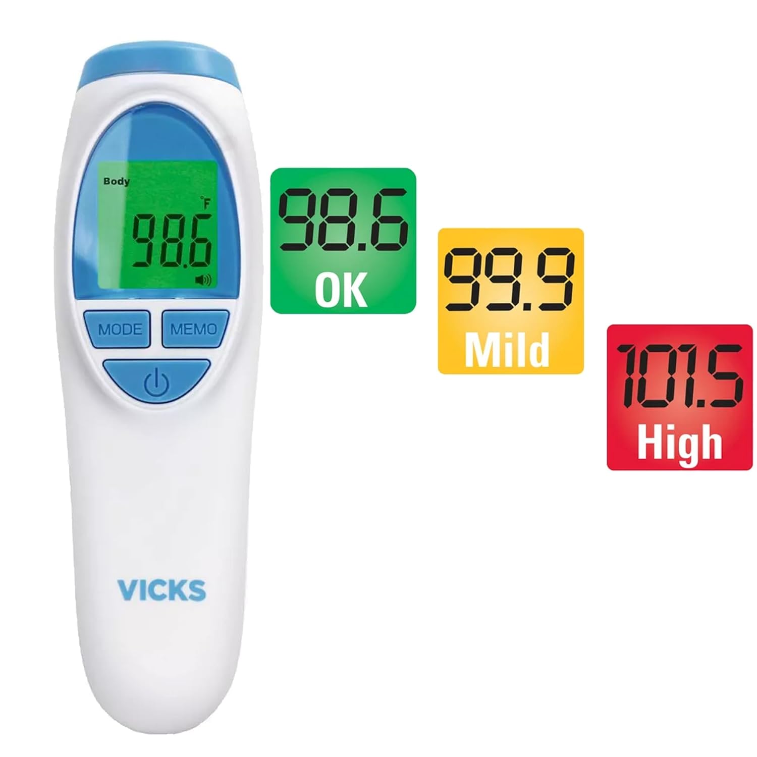 Advanced Technology for Excellent Performance: Goodbaby Thermometer is backed by clinical validated and recommended by the pediatrician. Fast and Easy Temperatures Readings: Taking your family’s temperature with this digital thermometer is as simple as pointing, and pressing a button. It uses infrared technology and can show readings in Celsius or Fahrenheit. Multi-mode Thermometer: The digital thermometer is designed for all ages, adults, infants, and elders. It not only supports the forehead function but is able to take room/object temperature. Reliable and Accurate: Our forehead thermometer has been clinically tested and found to be a fast and absolutely reliable gadget to use. It is ideal for forehead readings and has a very small error margin.The screen displays GREEN for a normal temperature, YELLOW for an elevated temperature, and (RED) for a high temperature. Clinically Proven No Touch Convenience Minimize the struggle or stress of temperature taking with instant, accurate forehead readings. Recommended for infants, children and adults. Safe and hygienic Avoid transferring germs with no touch readings. Forehead, Object or Liquid Measurement Reads temperature at the center of the forehead, food, bath water or other objects. Thermometer, 3-in-1, No Touch Contents: Vicks No Touch Thermometer; 2 AAA Alkaline Batteries. New! Professional accuracy. 2 Seconds. Measures forehead, food and bath temperatures. Reads in degrees F or degrees C. 3-in-1: 98.6; 99.5; 101.5. Fever InSight feature. The screen displays Green for a normal temperature, Yellow for an elevated temperature, and Red for a high temperature. Clinically Proven No Touch Convenience: Minimize the struggle or stress of temperature taking with instant, accurate forehead readings. Recommended for infants, children and adults. Safe and Hygienic: Avoid transferring germs with no touch readings. Forehead, Object or Liquid Measurement
