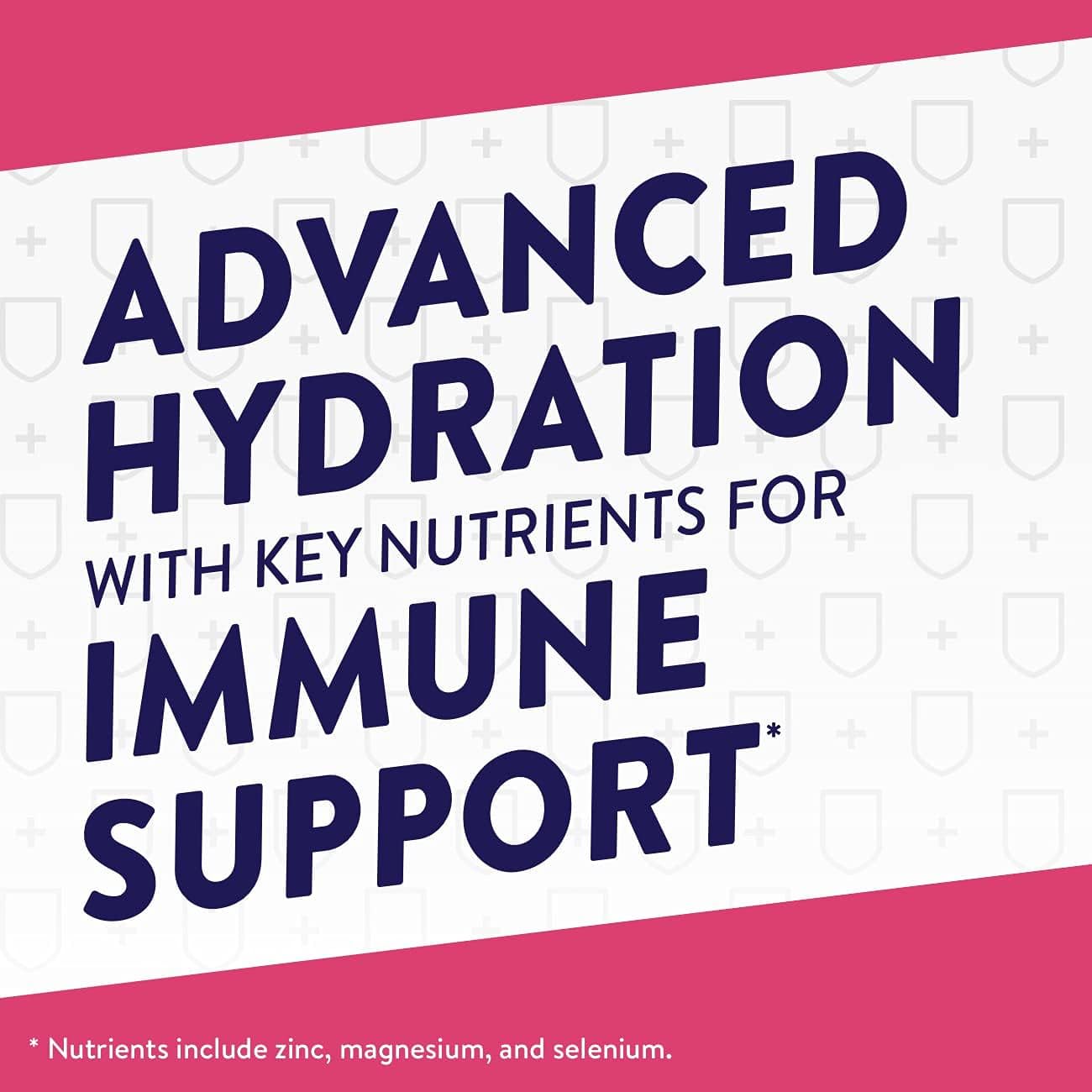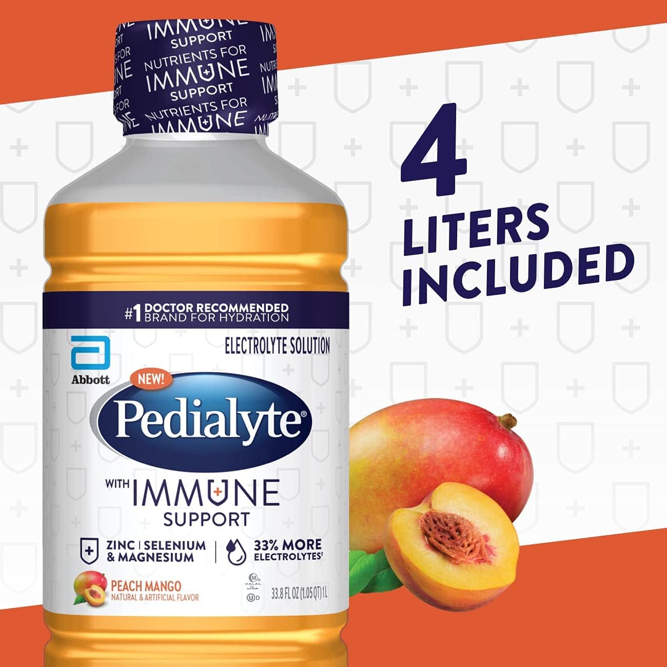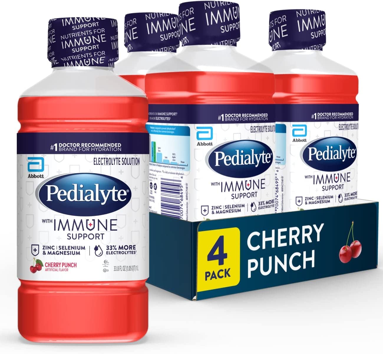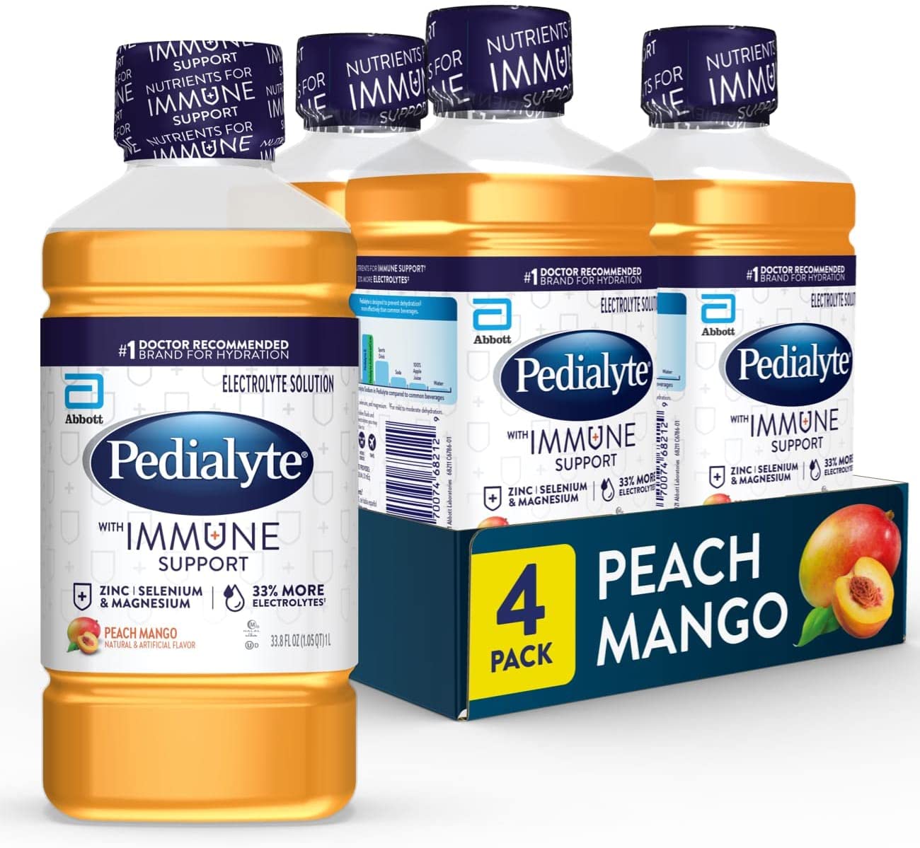 Pedialyte with Immune Support is an advanced hydration drink specially formulated with an optimal balance of sugar and electrolytes to help prevent mild to moderate dehydration in kids and adults. It has 3 key nutrients for immune support: Zinc to help build new immune cells, selenium to help protect cells, and magnesium to support immune response. Pedialyte with Immune Support has 33% more electrolytes* and is designed to replace fluids and electrolytes more effectively than other household beverages. It’s from the #1 doctor recommended brand in the US for hydration. Enjoy in great-tasting Peach Mango, Raspberry Lemonade, and Cherry Punch flavors. Feel better fast with Pedialyte! * 60 mEq sodium per liter compared to 45 mEq sodium in original Pedialyte.