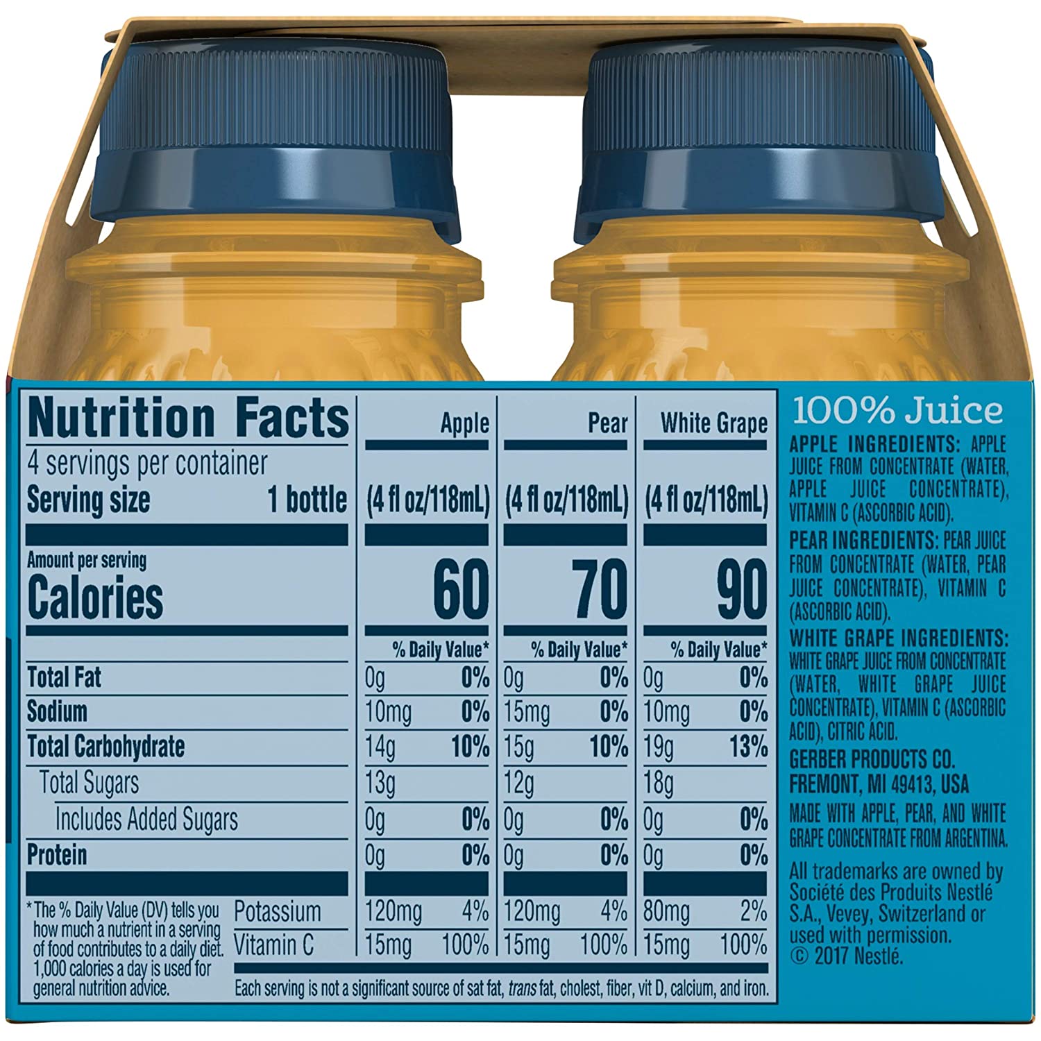 Gerber 100% Variety Pack Juice With Added Vitamin C & Citric Acid.2 Apple, 1 Pear, 1 White Grape Juices from concentrate. Real Fruit Juice.1 full serving of fruit in every bottle+.Rich in Antioxidant Vitamin C.Sitter.4 bottles. Variety Pack Includes: 2 Apple Juice, 1 Pear Juice & 1 White Grape Juice per pack. The goodness in each respective bottle starts with juice from: 3/4 apple, 3/4 pear, and 30 grapes. Every wholesome serving also includes: 100% juice with vitamin C and citric acid, 100% daily value of Vitamin C & sugar only from fruit juice. Package made with no BPA.