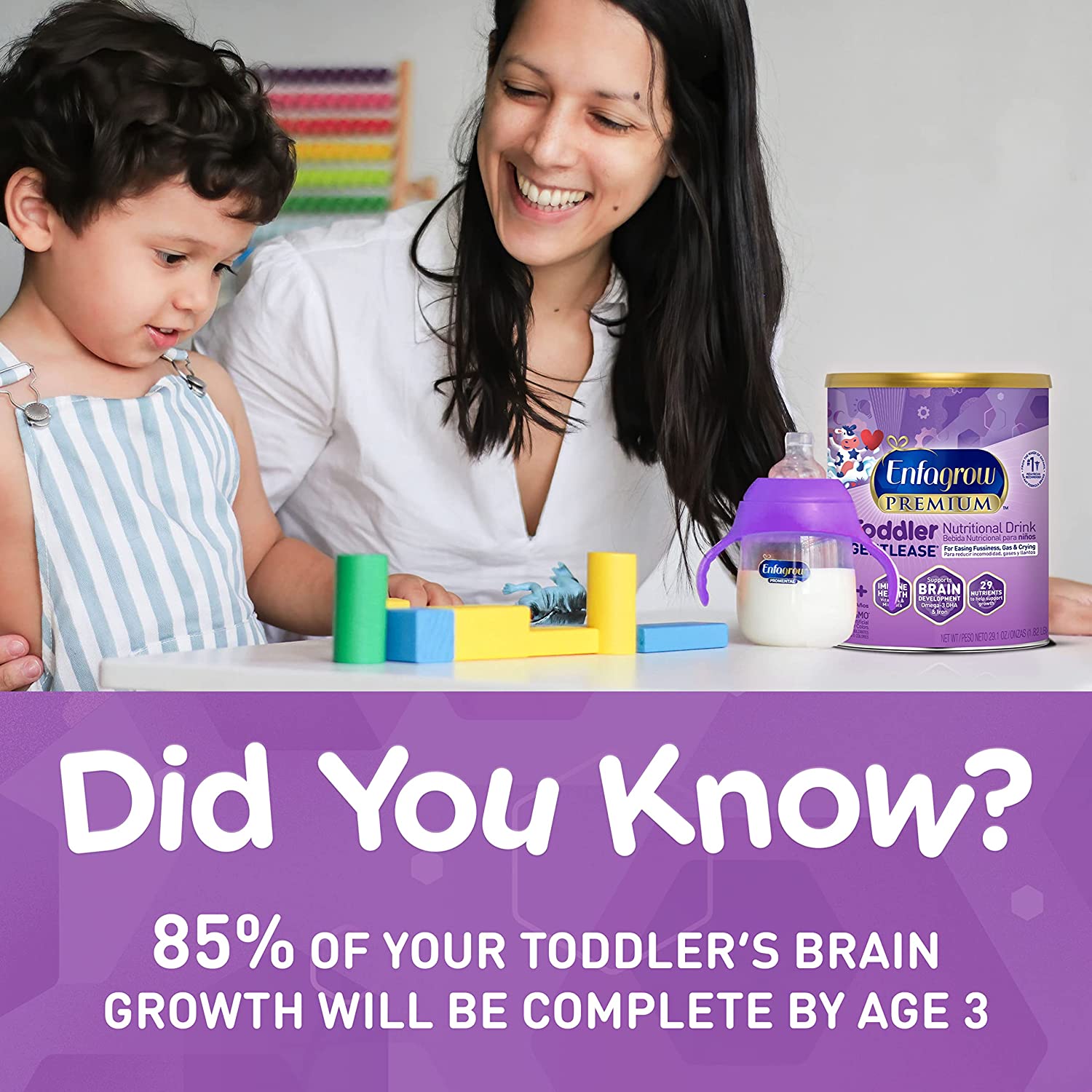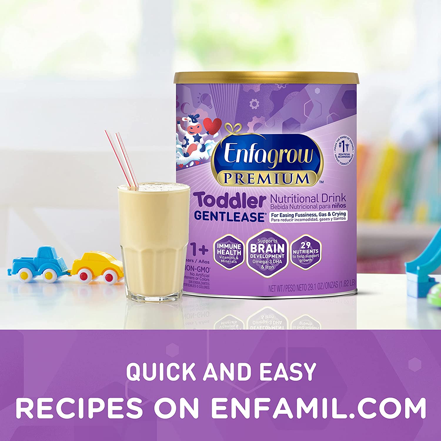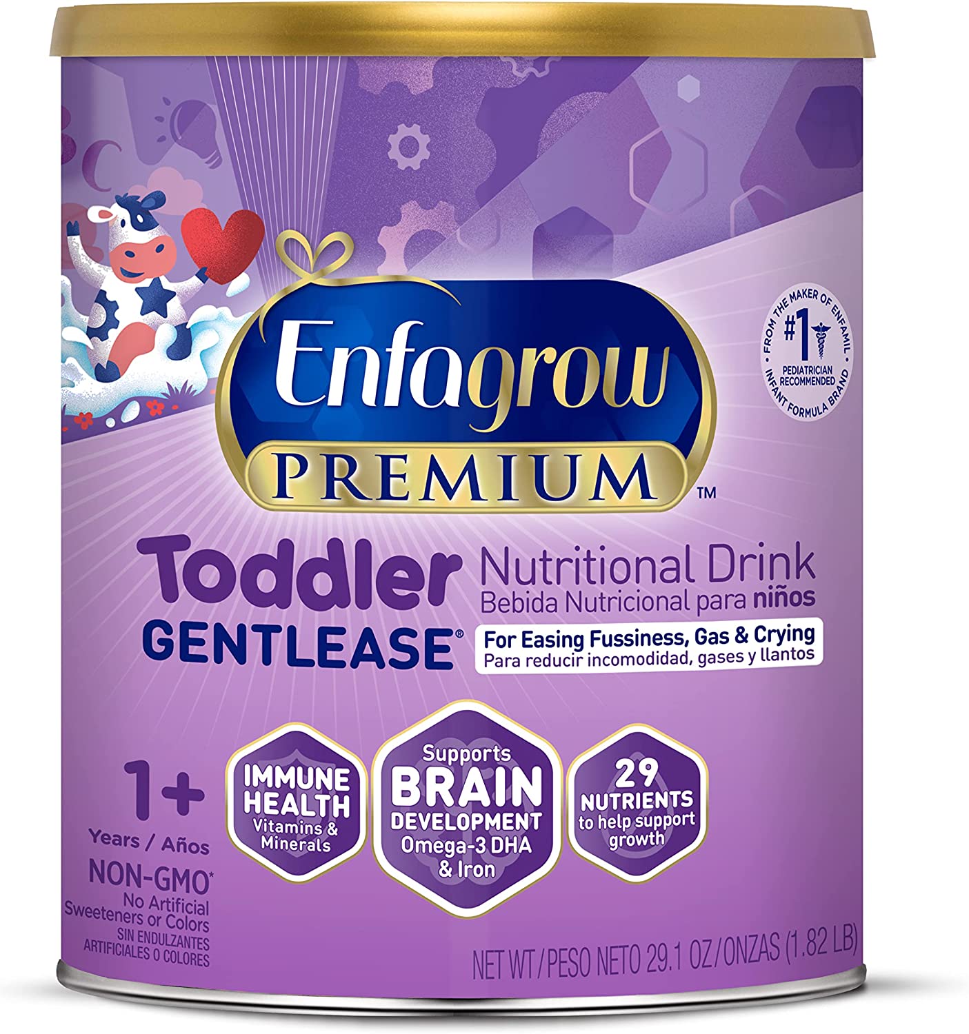 Gassy toddler? Enfagrow PREMIUM Gentlease Toddler Nutritional Drink is designed for sensitive, still-growing bellies! Enfagrow Premium Gentlease Toddler Nutritional Milk Drink is a nutritional toddler drink made with real milk and fortified with vitamins. Enfagrow is for growing children ages 1 year & up. The transition from baby formula or breast milk to cow's milk can lead to an 80% drop in brain nourishing Omega-3 DHA consumption. And 85% of brain growth happens in your baby's first three years. That's why it's important to provide brain support with Enfagrow Gentlease Toddler Nutritional Milk Drink. It contains 26mg of omega DHA per serving, Enfamil is the #1 pediatrician recommended brand of Infant Formula - QuintilesIMS, using the ProVoice Survey fielded from October 1, 2016 to September 30, 2017. Not made with genetically modified ingredients, but trace amounts of genetically engineered materials may be present in the product from manufacturing environments and process sources.