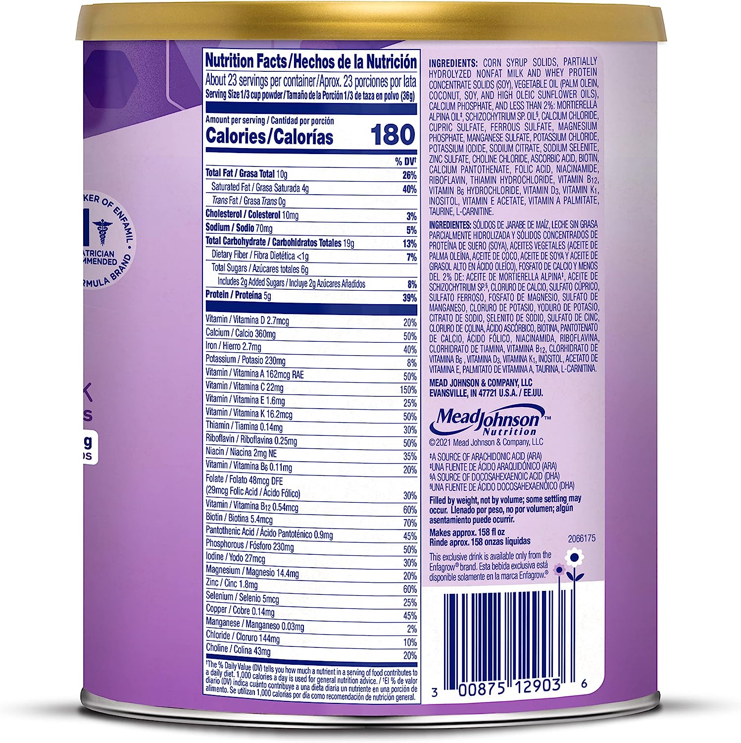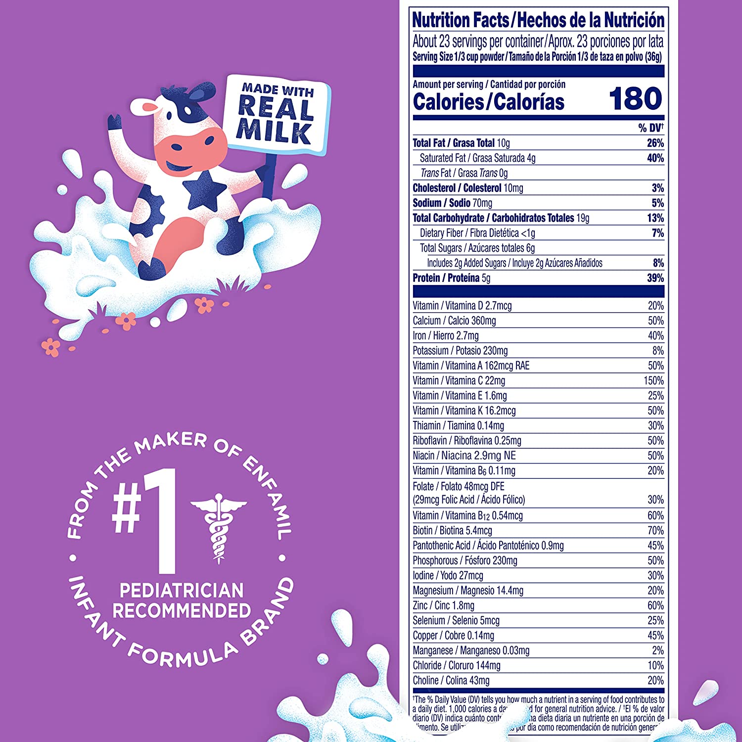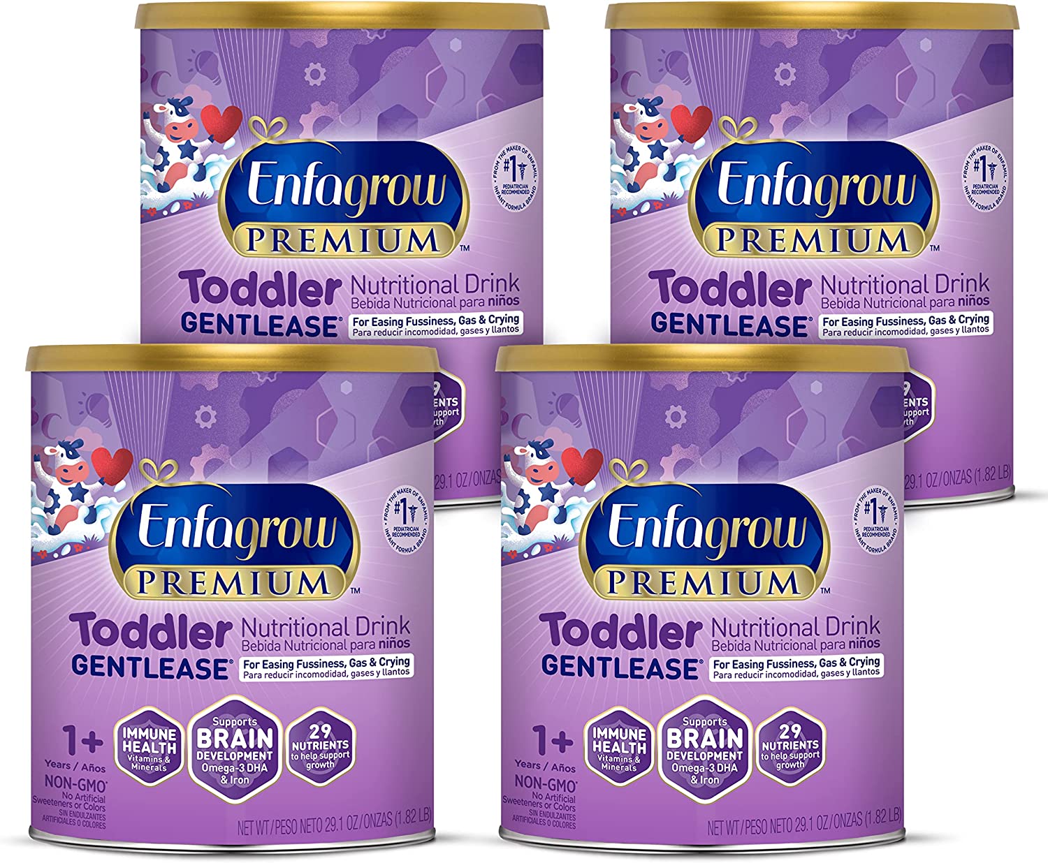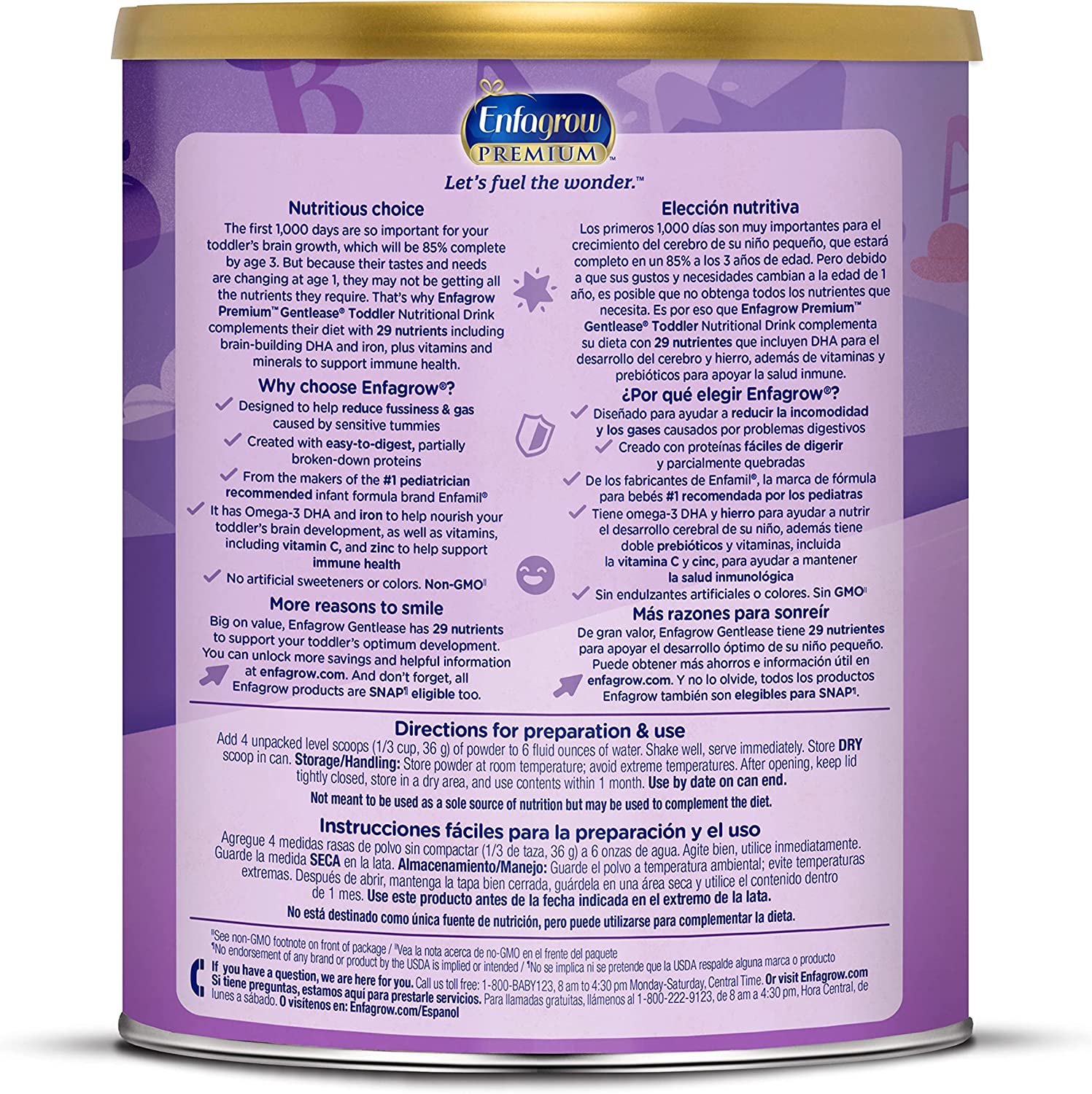 Gassy toddler? Enfagrow PREMIUM Gentlease Toddler Nutritional Drink is designed for sensitive, still-growing bellies! Enfagrow Premium Gentlease Toddler Nutritional Milk Drink is a nutritional toddler drink made with real milk and fortified with vitamins. Enfagrow is for growing children ages 1 year & up. The transition from baby formula or breast milk to cow's milk can lead to an 80% drop in brain nourishing Omega-3 DHA consumption. And 85% of brain growth happens in your baby's first three years. That's why it's important to provide brain support with Enfagrow Gentlease Toddler Nutritional Milk Drink. It contains 26mg of omega DHA per serving, Enfamil is the #1 pediatrician recommended brand of Infant Formula - QuintilesIMS, using the ProVoice Survey fielded from October 1, 2016 to September 30, 2017. Not made with genetically modified ingredients, but trace amounts of genetically engineered materials may be present in the product from manufacturing environments and process sources.