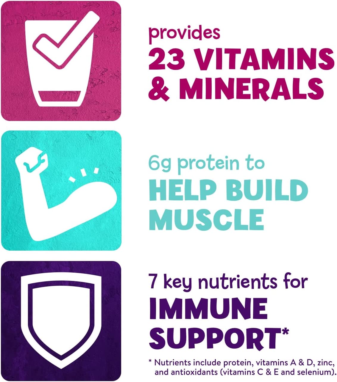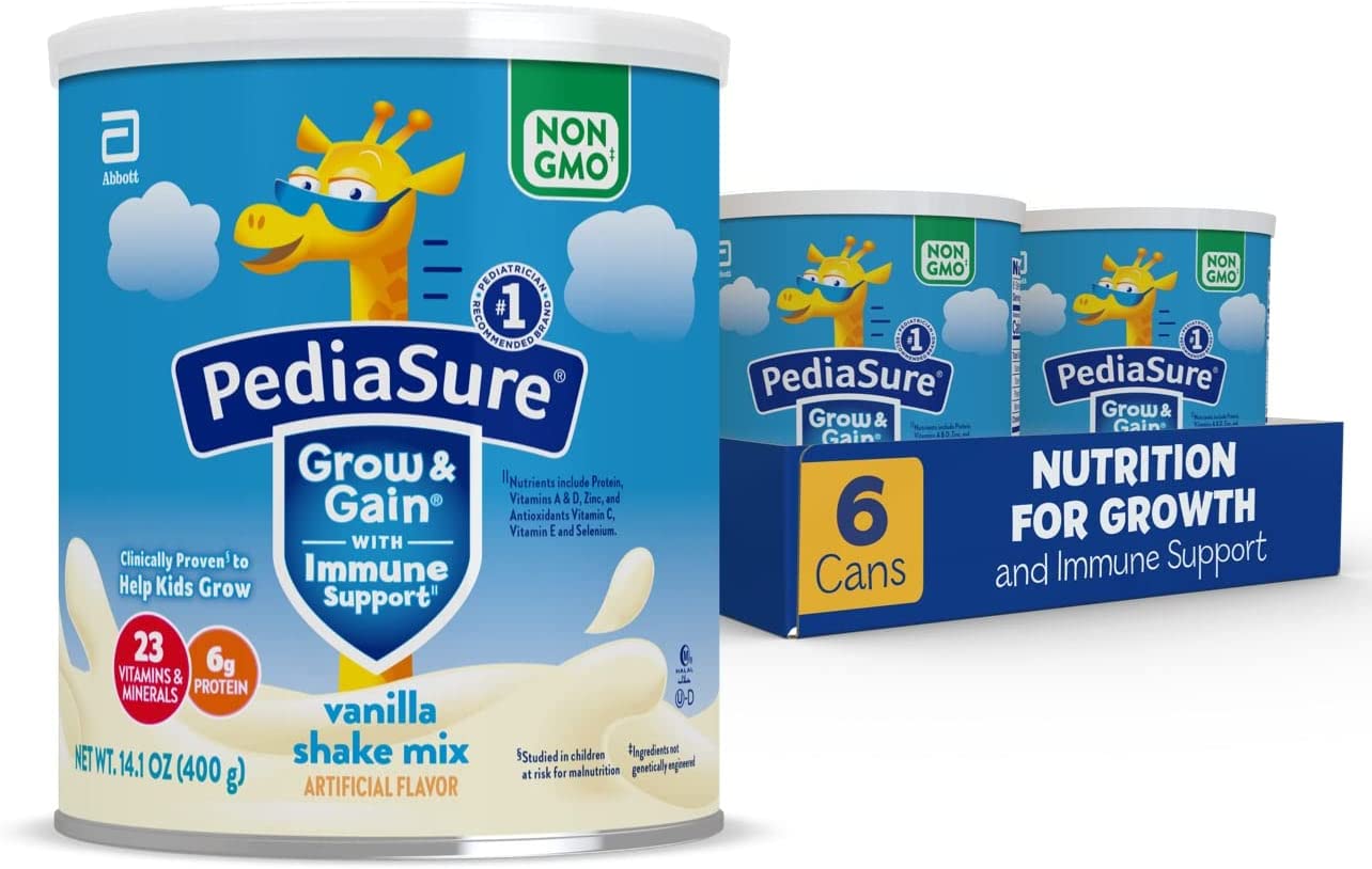 PediaSure Grow & Gain with Immune Support* kids shake mix is clinically proven† to help kids grow. It has 23 essential vitamins & minerals and 7 key nutrients for immune support,* including 6 grams of protein to help build muscles. PediaSure Grow & Gain is non-GMO,‡ gluten-free, has no artificial growth hormones,§ and is suitable for lactose intolerance.|| Just mix with water, add to a recipe or a smoothie, and enjoy. From the #1 pediatrician recommended brand. * Nutrients include protein, vitamins A & D, zinc, and antioxidants (vitamins C & E and selenium). † Studied in children at risk for malnutrition, 2 servings per day. ‡ Ingredients not genetically engineered. § No significant difference has been shown between milk derived from rbST-treated and non-rbST-treated cows. || Not for children with galactosemia.