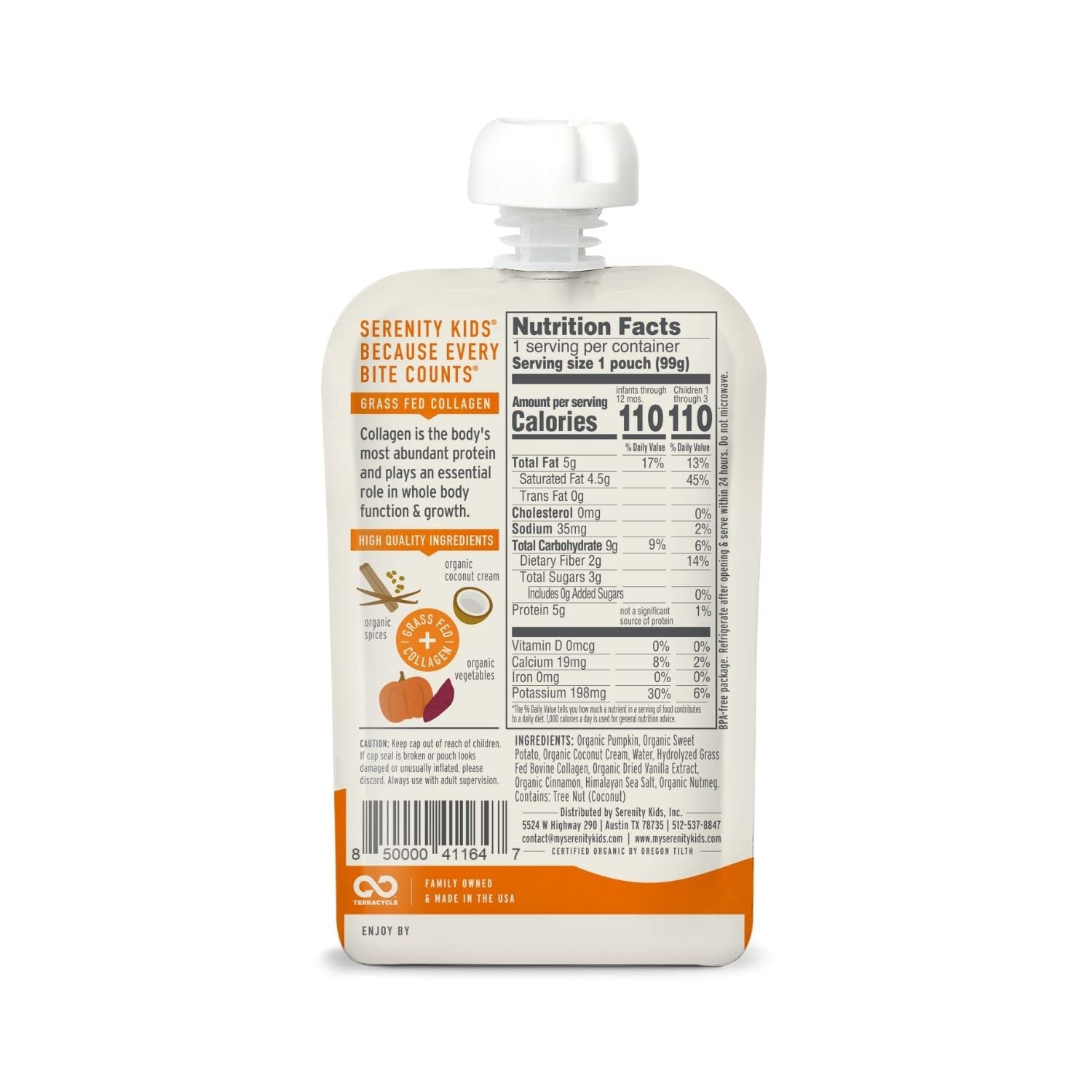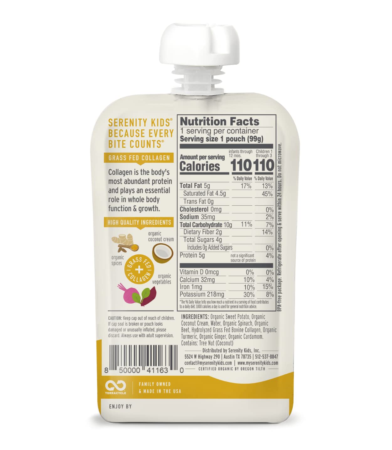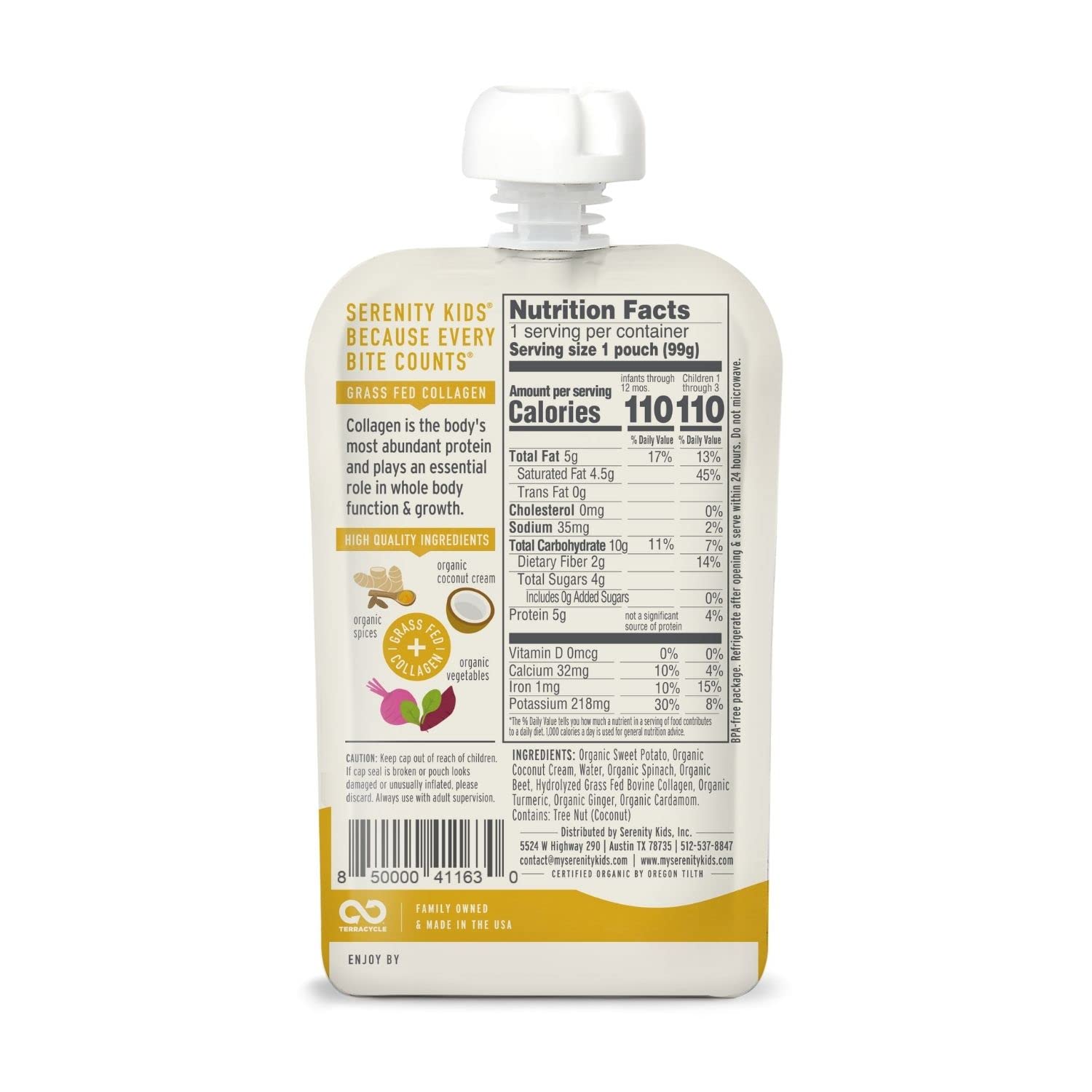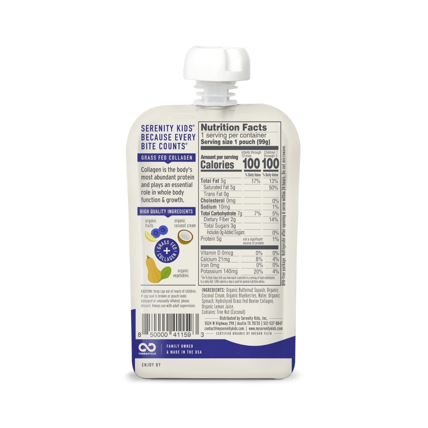• RECYCLE YOUR POUCHES: Create a TerraCycle account and start collecting finished Serenity Kids baby food pouches in the freezer to prevent any odors. When ready, place the collection into any box you have at home and log into your account to download and print a pre-paid shipping label. Seal your collection box, tape on the printed shipping label, and send it via UPS to be recycled. Feel good knowing that TerraCycle gives your pouches a second life!