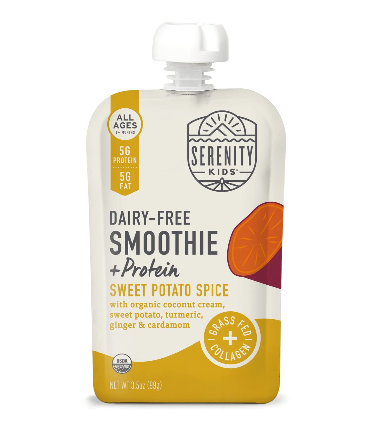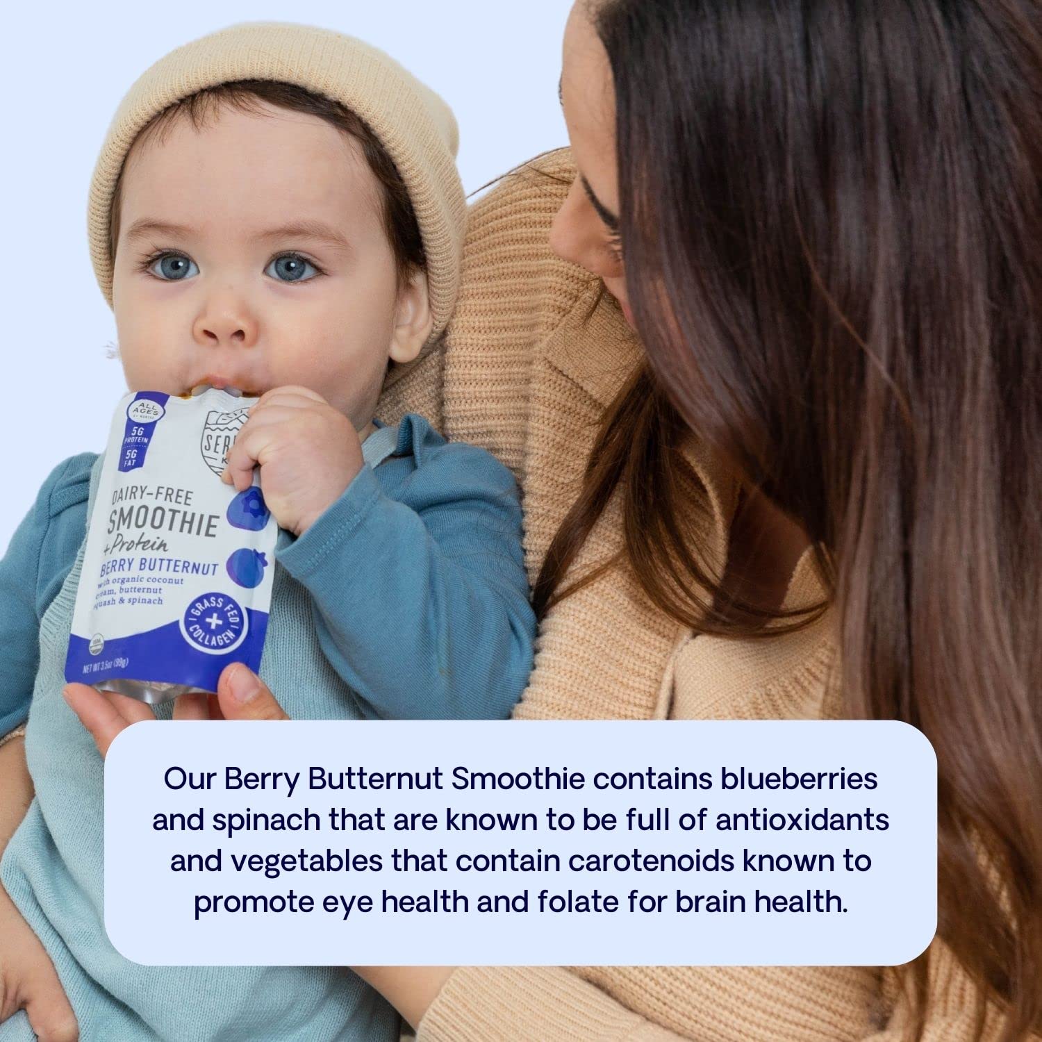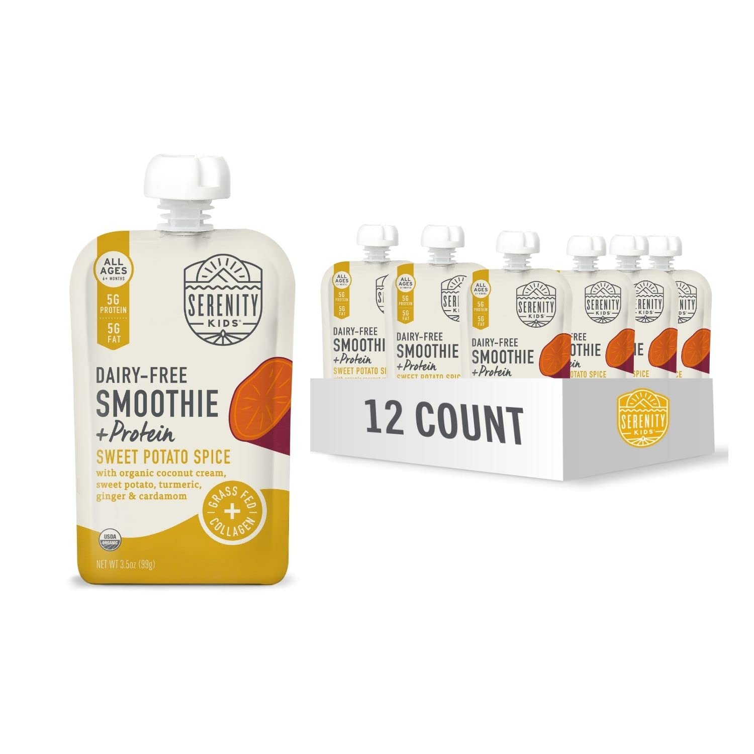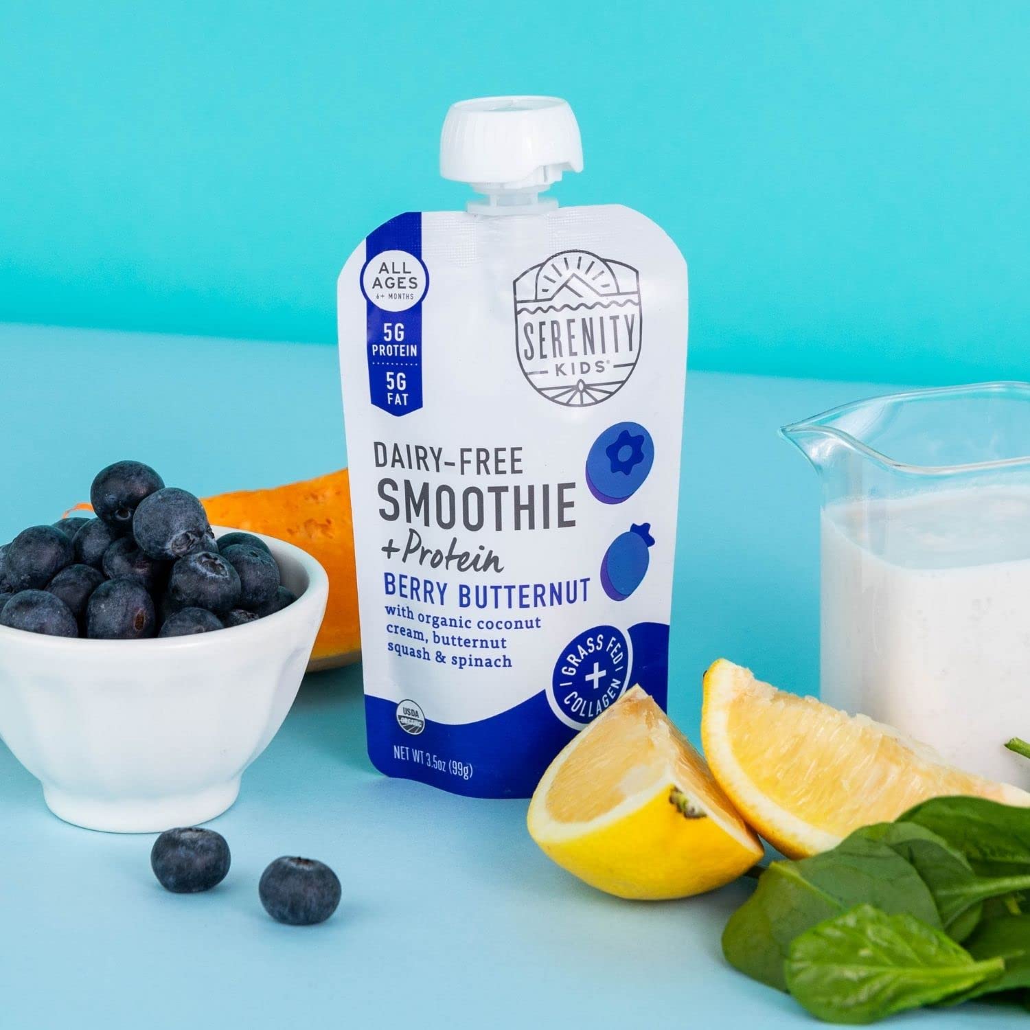 Serenity Kids 6+ Months Dairy-Free Smoothie Baby Food | USDA Organic | Grass Fed Collagen Protein | 3.5 Ounce BPA-Free Pouch | Berry Butternut | 6 Count