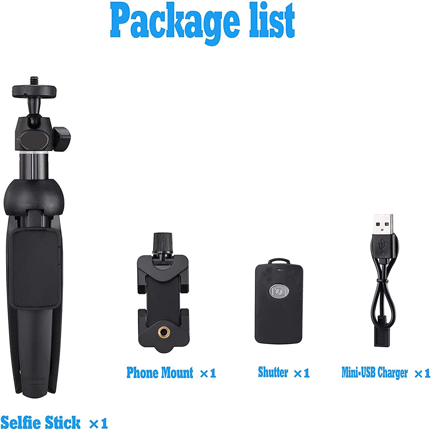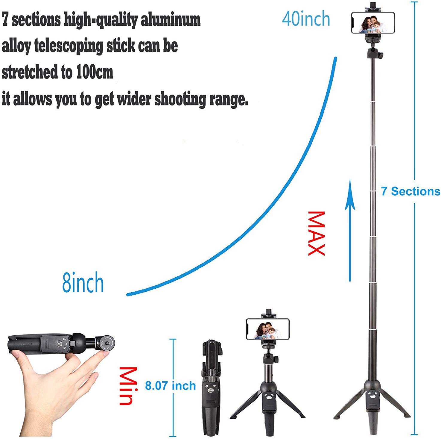 • 【Three-in-one Selfie Stick and Tripod Stand】Selfie stick tripod can be extended between 8.07 to 40 inches, which makes it very suitable for Photograph, Face time, Business, living broadcasting more. It features a fully expandable handheld selfie stick handle with built-in collapsible legs that allow it to double as a stand-alone tripod when opened. You can easily switch between Selfie Stick Mode & Phone Tripod Mode for your preferred use.