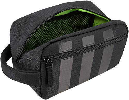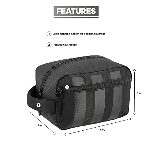 Details: The team toiletry kit's main zippered compartment opens wide to store everything you need for a night away or a week on the road. extra outside zippered pocket for storage.
