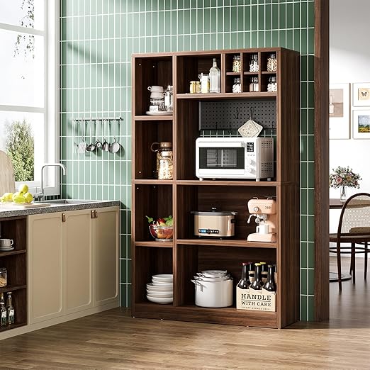 Tribesigns 5-Tier Baker's Rack, Large Microwave Stand with Shelves, 65-Inch Tall Coffee Bar Standing Kitchen Storage Rack Kitchen Shelf with Pegboard & 8 S-Shaped Hooks, Walnut