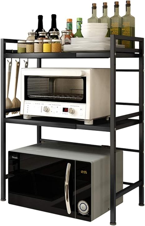 WHIFEA 3-Tier Adjustable 15.74''-23.62'' Heavy Duty Shelving Microwave Rack Horizontal Extension Kitchen Shelf Tableware Storage Stand Organizer with 3 Hooks for Home Office Carbon Steel Matte Black