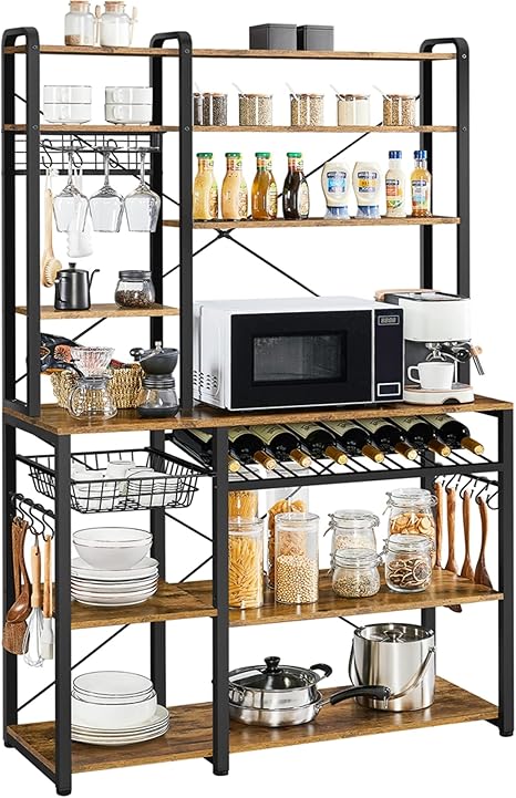 Yaheetech 43.5" W Kitchen Bakers Rack with Pull Out Wire Basket, 8 Tiers Microwave Stand Coffee Bar Station w/Wine Rack & Glass Holder & 12 Hooks, Utility Storage Shelf for Dining Room, Rustic Brown
