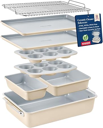 Bakken 8-Piece Stackable Bakeware Set - Ceramic Non-Stick Coating, Baking Sheets, Assorted Baking Pans, PTFE, PFOA & PFOS Free - Healthy Baking, Ergonomic Handles, Cooling Rack, Non-Toxic, Oven-Safe