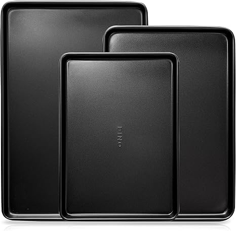 BINO Bakeware Nonstick Cookie Sheet Baking Tray Set, 3-Piece - Black | Non Stick Baking Pans Set | Carbon Steel Tray Bakeware Sets | Oven Safe Baking Set | Cookie Sheet Pans | Food-Safe Tray