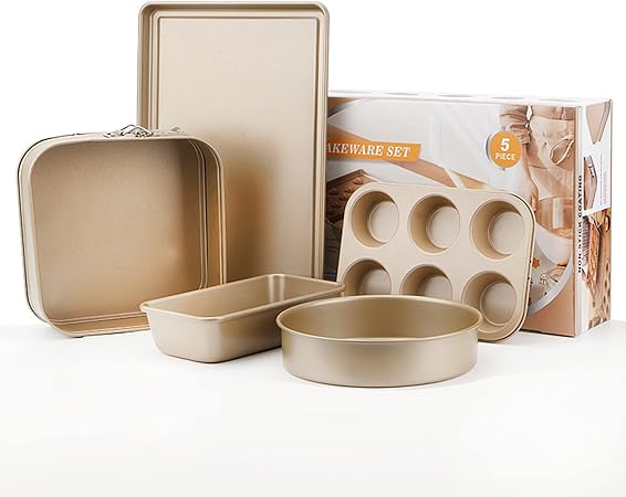 Nonstick Baking Pans Set for Starter, 10x15Inch Cookie Sheet Tray 6 Cup Muffin Tin 9Inch Round and Square Springform Cake Pan 1Lb Loaf Bread Pan Carbon Steel Bakeware 5pcs Non-Toxic BPA Free