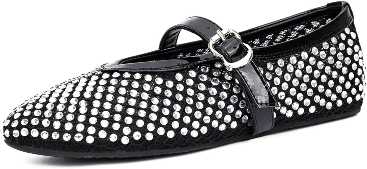 Rhinestone Women's Mesh Ballet Flats with Buckle Strap Mary Jane Ballerina Shoes Comfy Casual Dress Shoes Office 5.5 US