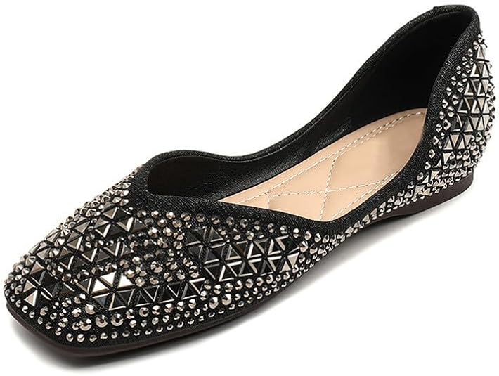 Women's Square Toe Flats Rhinestone Dressy Shoes Wedding Low Wedges Sparkly Ballet Flats