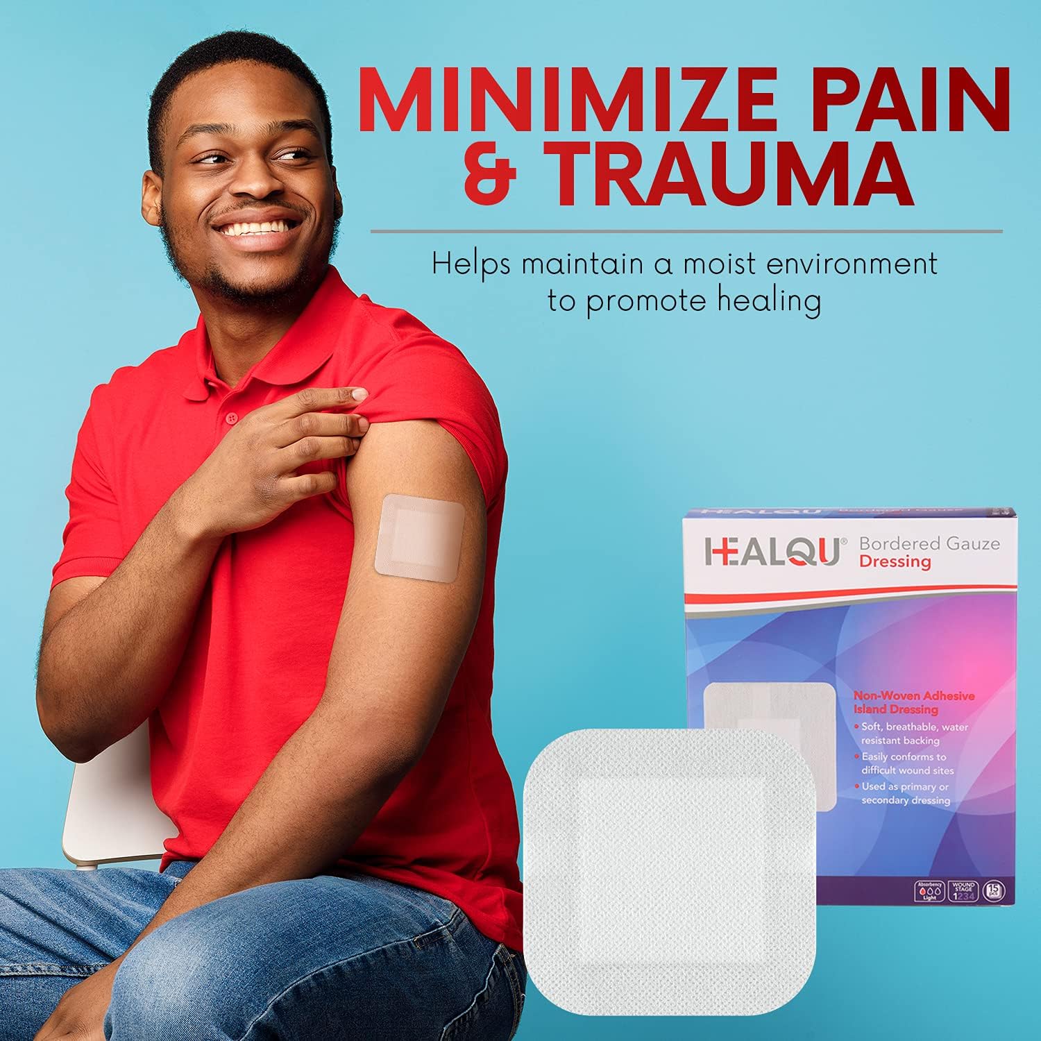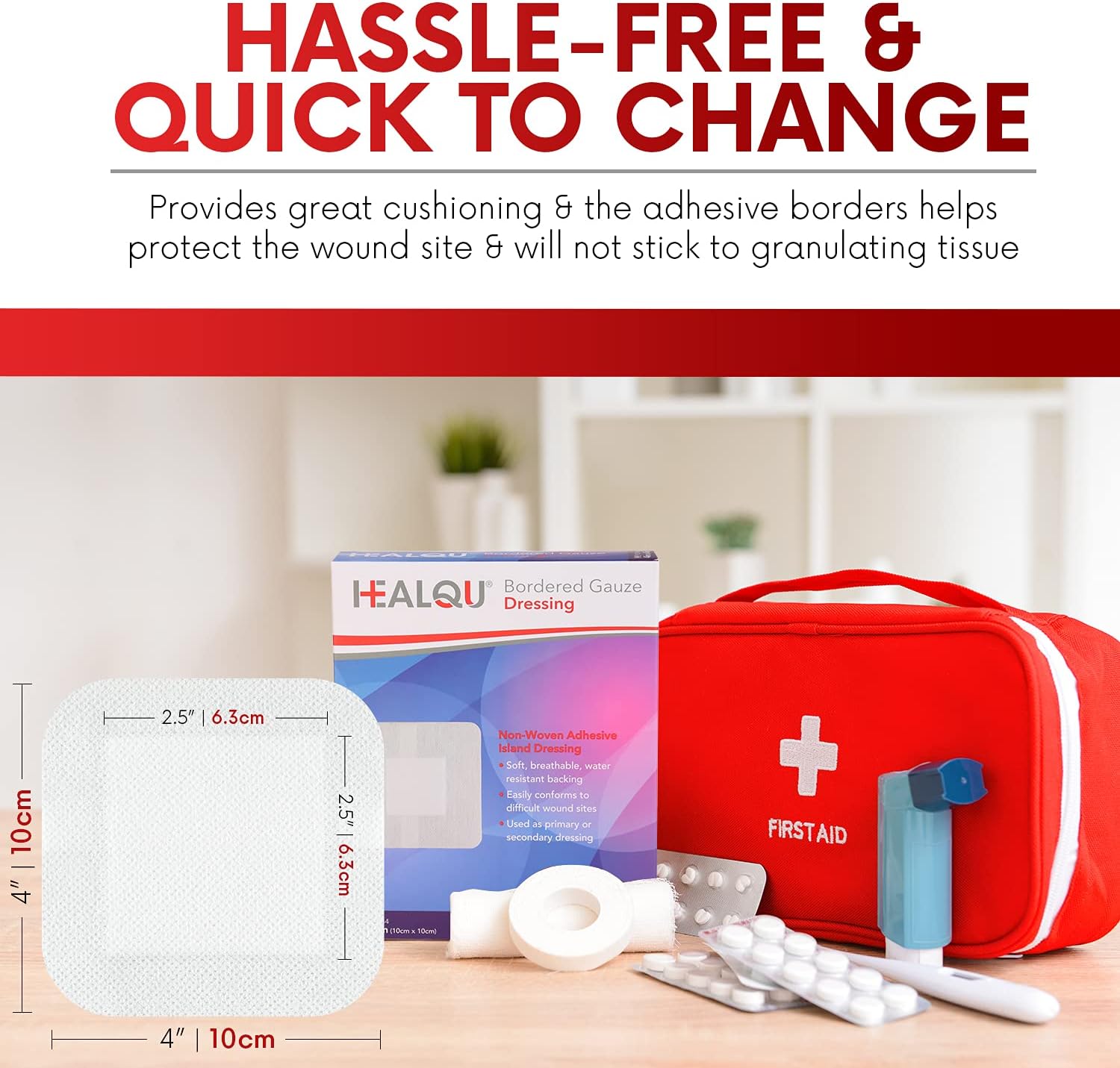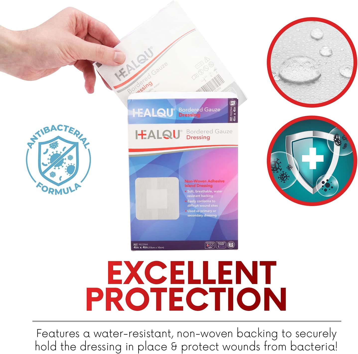 HEALQU Bordered Gauze Island Dressing - 30 Count, 4" x 4" Sterile Individually Wrapped Gauze Pads with Water-Resistant, Non-Woven Backing - Soft and Breathable Wound Dressing for First Aid and Medical