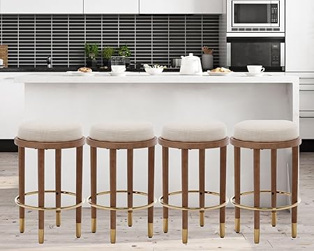 26_‹__‹_ Rustic Backless Bar Stools with Metal Gold Footrest Counter Height Bar Stools Set of 4 Farmhouse Beige Linen Upholstered Wood Bar Stools Modern Round Kitchen Stools with Natural Solid Wood Leg