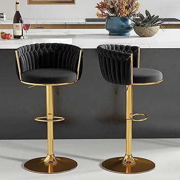ABET Gold Bar Stool Set of 2, Velvet Swivel Barstools, Height Adjustable Counter Stools with Woven Back, Upholstered Modern Luxury Kitchen Stools with Footrest for Cafe, Pub, Black