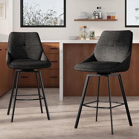 AMERLIFE Counter Height Bar Stools Set of 2, 360ï� Swivel Bar Stools with Curved Back and Large Seat Cushion, 41" Tall Linen Bar Chair with Metal Footrest, Modern Barstools for Kitchen Island, Black