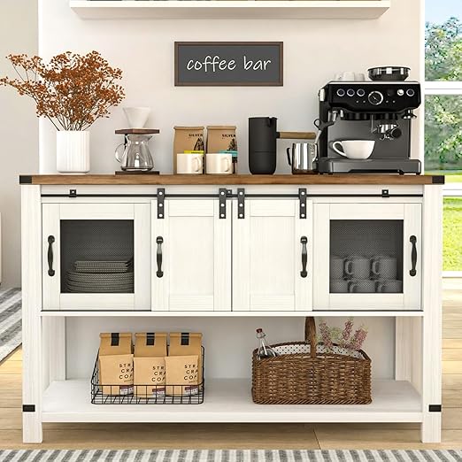 4ever2buy Farmhouse Coffee Bar Cabinet with Storage, 47'' Coffee Bar Table with Sliding Barn Door, White Coffee Buffet Cabinet with Metal Mesh Doors, Console Table with Bottom Open Shelf, Living Room