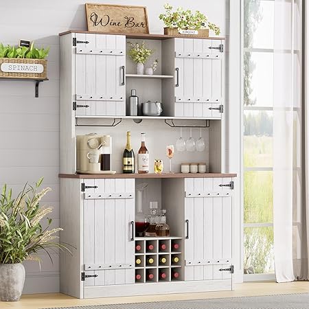 71" Farmhouse Kitchen Cabinet Pantry Bar Cabinet with Storage and Adjustable Shelves, Wine Cabinet with 12 Wine Racks, Sideboard Cabinet with Large Countertop for Kitchen&Dining Room, Oak & White