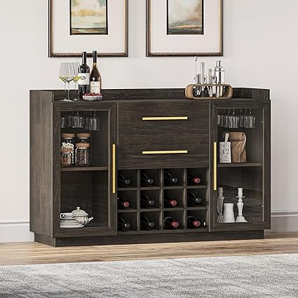 BELLEZE 55" Wine Cabinet, Sideboard Buffet with Wine Rack and Glass Holder, Home Coffee Bar Freestanding Liquor Cabinet with Display Glass Doors for Living Room, Dining Room - Marcel (Brown)