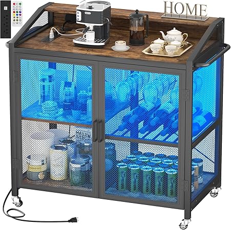 Cyclysio Bar Cabinet with Lights, Wine Cabinet with Power Outlet and Glass Holder, Liquor Cabinet with Storage, Coffee Bar Cabinet for Home, Rustic Brown
