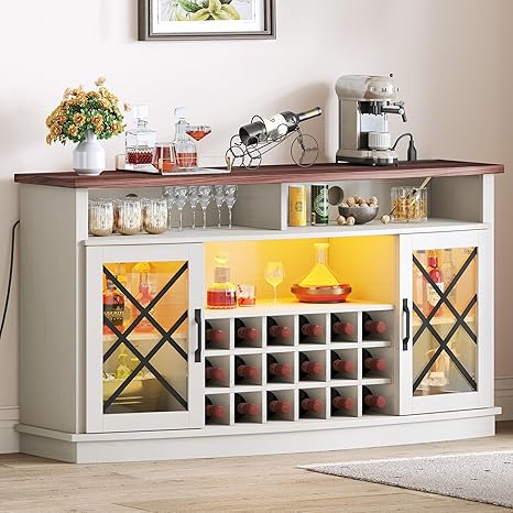 DWVO Wine Bar Cabinet with Charging Station, 58'' Large Wine Cabinet w/Storage, Tempered Glass Doors, Adjustable Shelf, 32'' Tall Coffee Bar for Living Room, Dining Room, White