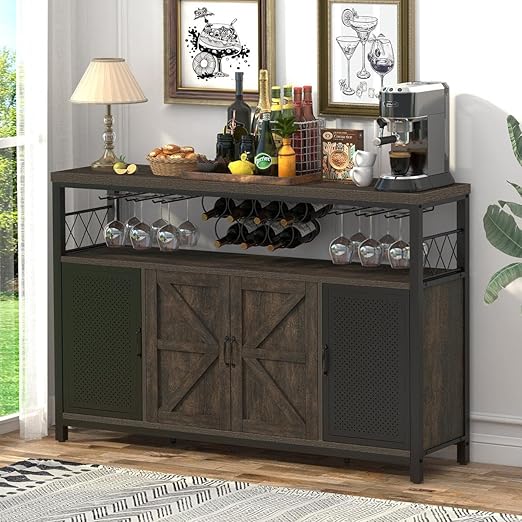 Farmhouse Liquor Cabinet Bar for Home, Large Coffee Bar Cabinet with Storage, Rustic Buffet Sideboard with Wine Rack and Glass Holder, 51.34" (Walnut Brown)