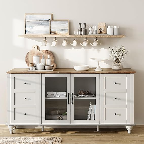 FITUEYES Sideboard Buffet Cabinets with Glass Door, Kitchen Storage Cabinets, Wood Coffee Bar Tables, Accent Sideboard Storage Cabinet Table Dining Room, Living Room, White