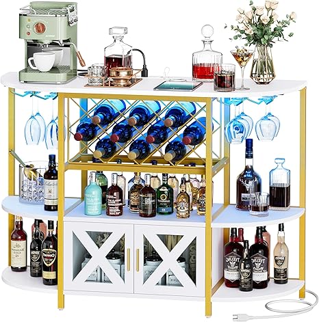 YITAHOME Wine Bar Cabinet w/Power Outlets, Home Bar Table with LED Lights, Metal Liquor Cabinet Bar Stand with 4-Tier Storage Shelves, 2 Doors, Wine Racks and Glass Holders, Gold