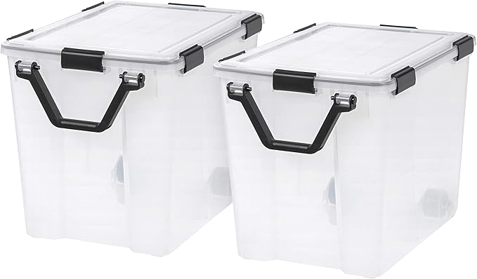 IRIS USA WeatherPro 103 Qt Storage Bins with Lids, 2 Pack, BPA-Free Plastic Gasket Box with Tight Latch and Seal, Stackable Nestable Tote Tub - Clear/Black