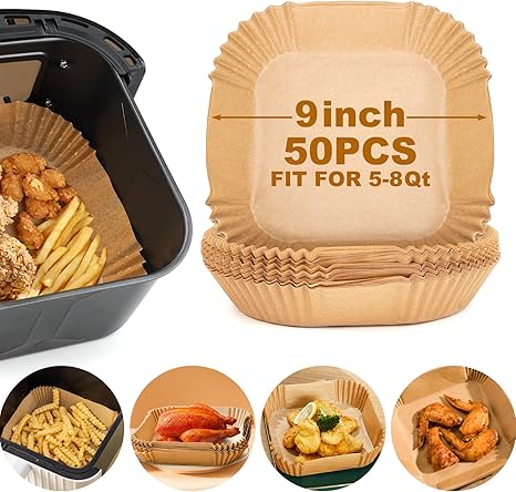 Air Fryer Paper Liners Disposable - 50pcs 9 Inch Parchment Paper Sheets Square, Non-stick Airfryer Basket Liners for Baking Roasting Microwave