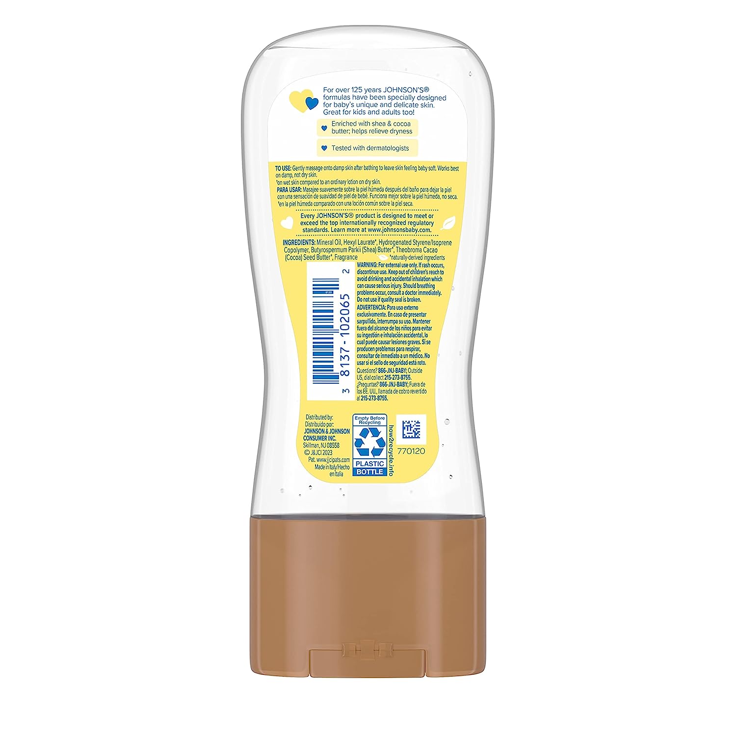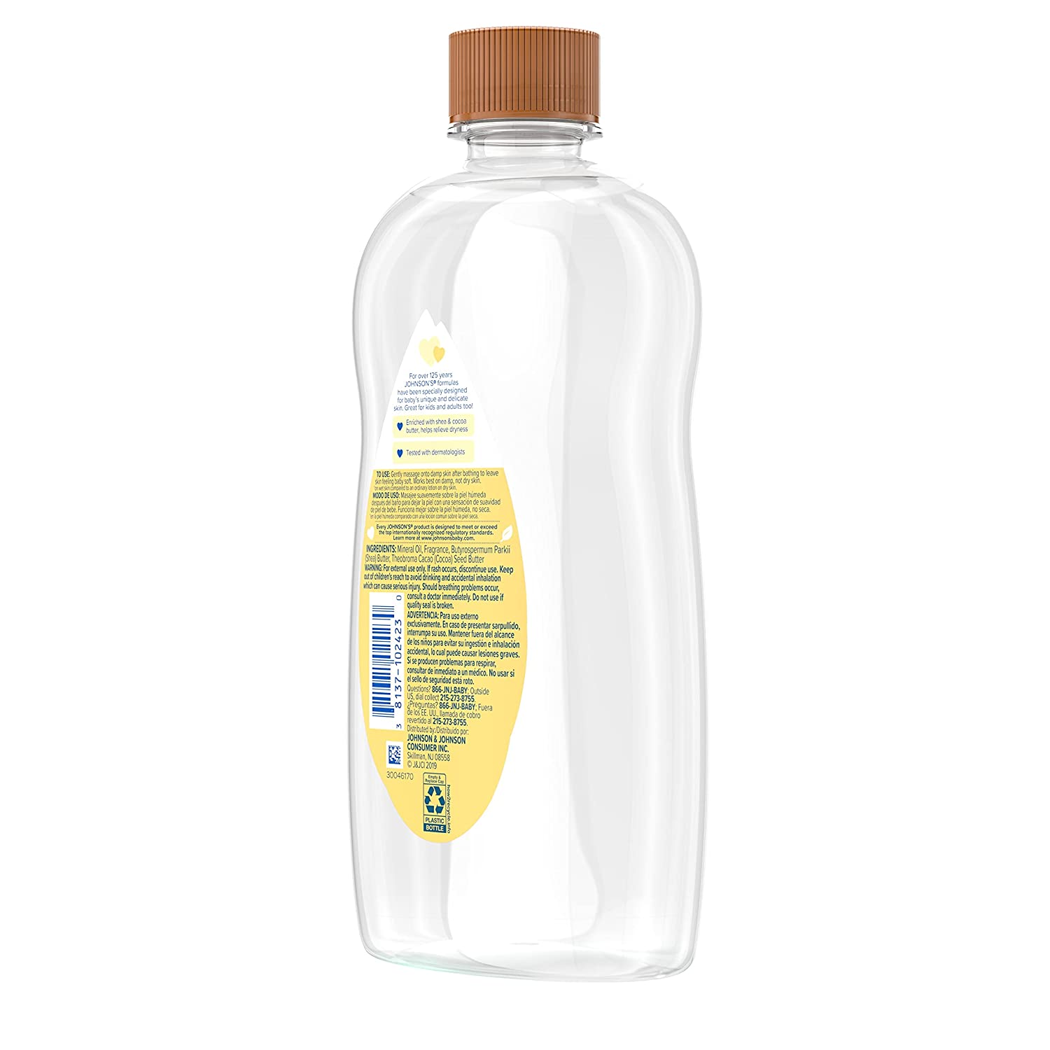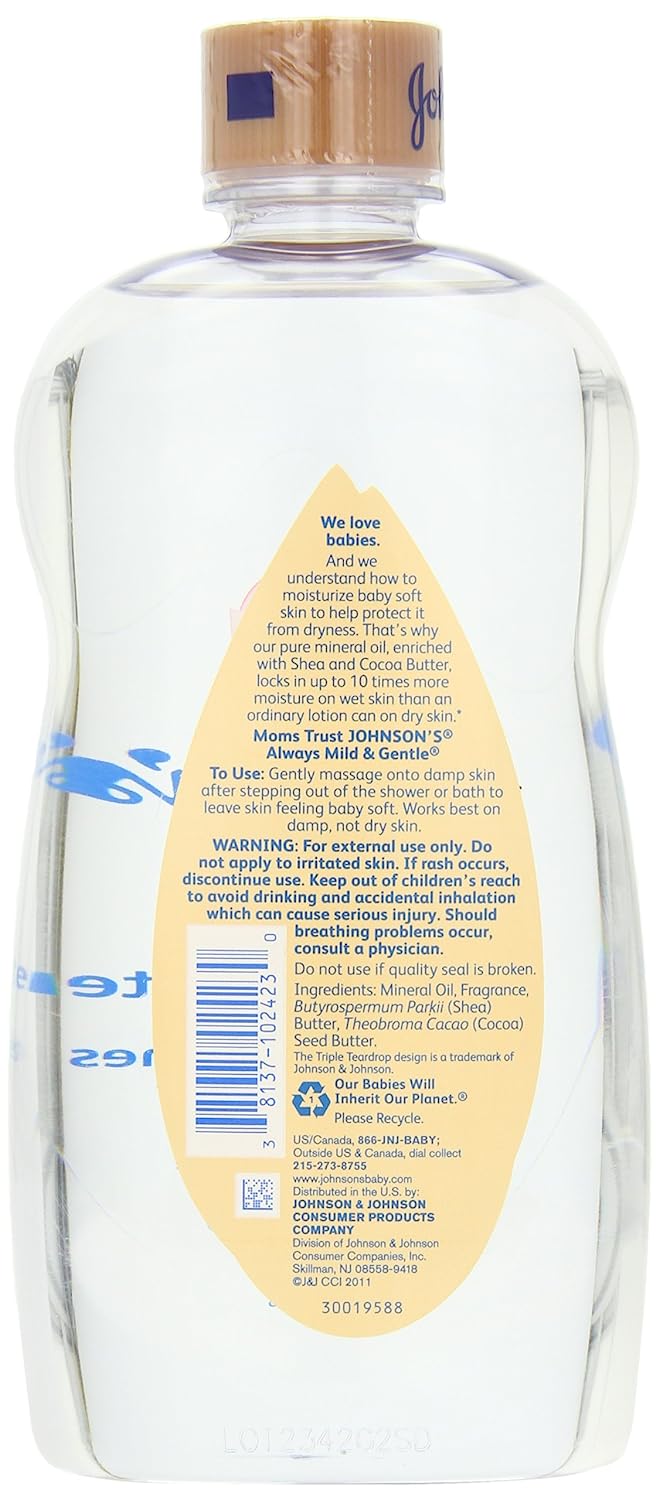 Enriched with natural, nourishing ingredients that soothe and protect skin. This concentrated gel contains cocoa butter, known for its skin nourishing properties, as well as Shea, known for its skin conditioning. Johnson's baby oil gel with shea & cocoa butter locks in up to 10 times more moisture on wet skin than an ordinary lotion can on dry skin. To use, gently massage baby oil onto damp skin after bathing to leave skin feeling baby soft. This baby oil gel works best on damp skin.