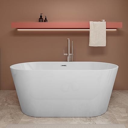 55 inch Freestanding Soaking Bathtub, Modern Stand Alone Free Standing Acrylic Tub with Center Drain & Overflow, Glossy White