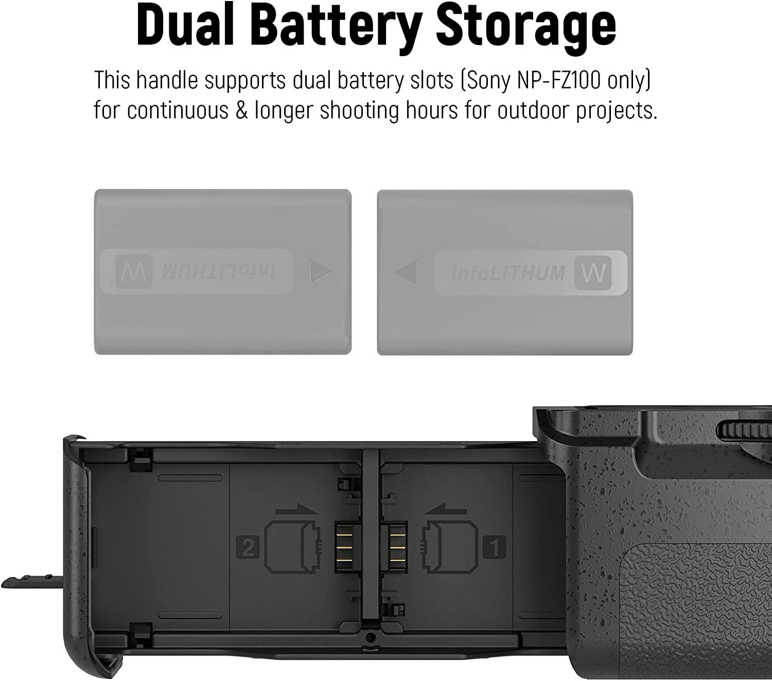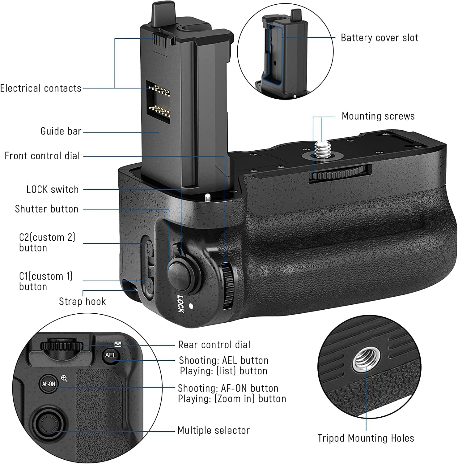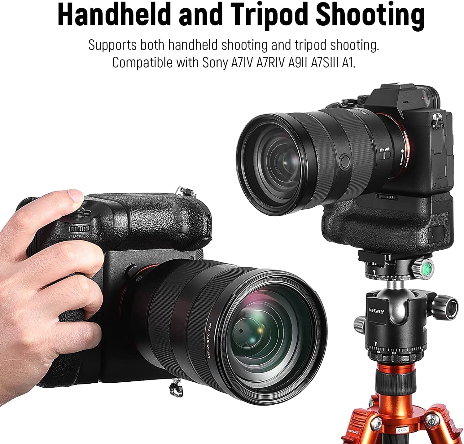 • 【Battery Grip Compatible with Sony】Ergonomically designed, this battery grip provides a comfortable handheld grip to hold your camera. By storing one or two NP-FZ100 batteries, the grip is compatible with Sony A9II A7IV A7RIV A7SIII A1 Cameras BG A7IV to extend camera battery life for longer shooting time. Via its bottom 1/4” threaded hole, it can also be mounted on a tripod