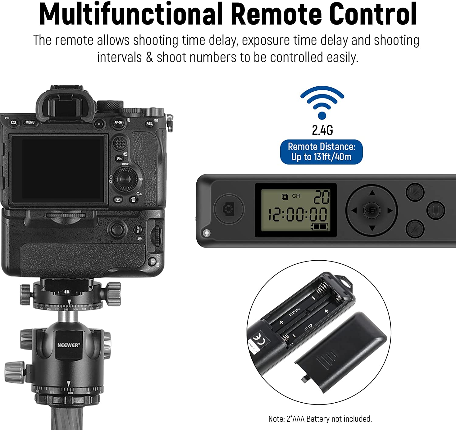 • 【Multifunctional Remote Control】 The remote control pairs with the battery grip via 2.4G transmission and the control distance is up to 131ft/40m. The multifunctional remote with LCD display supports focusing/photography, infrared shooting, and the photographer is free to set delay time, exposure time, intervals and shoot numbers. In addition, LCD screen lock supported