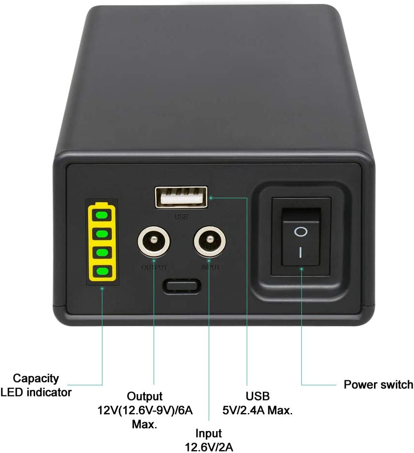 • High capacity, Last longer: 3.7V/ 38400mAh (=11.1V/ 12800mAh)【PB120B1 12/5V lithium ion battery pack is constructed from 12pcs High Quality 18650 cells in 3s4p. The capacity of each cell is 3200mah at 3.7V】【Output: 12V (voltage range is 12.6-9V) /6A Max. 5V/2.4A Max.】【Input: 12.6V/2A】