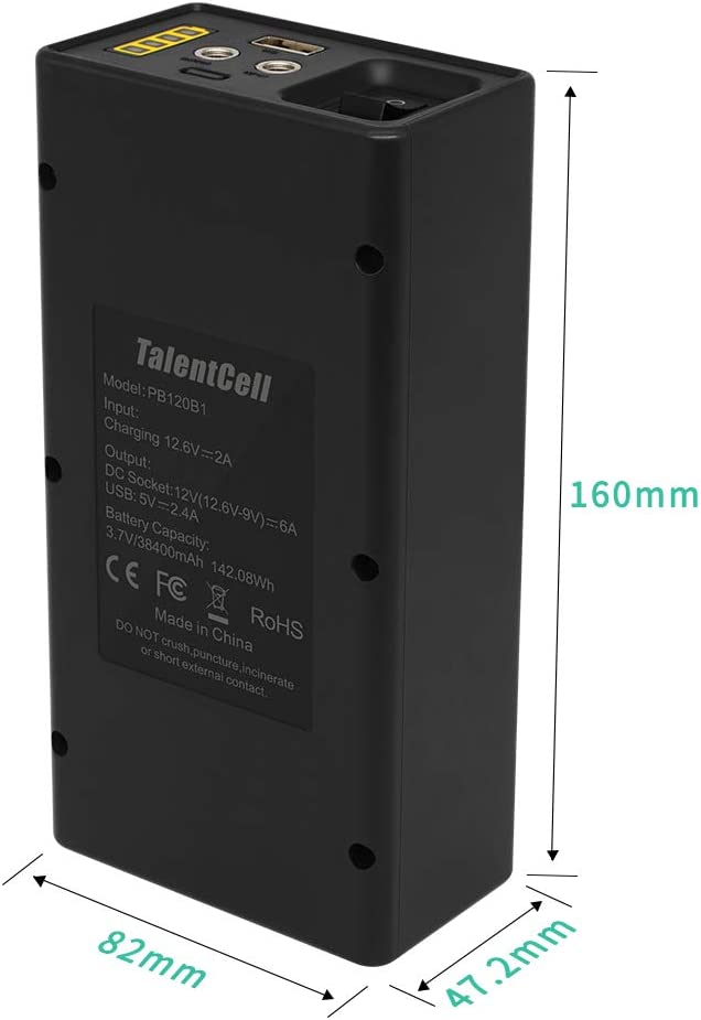TalentCell 12V Lithium ion Battery PB120B1, Rechargeable 38400mAh 142.08Wh Li-ion Battery Pack with DC 12V and 5V USB Output for LED Light Strip, CCTV Camera, Mobile and More