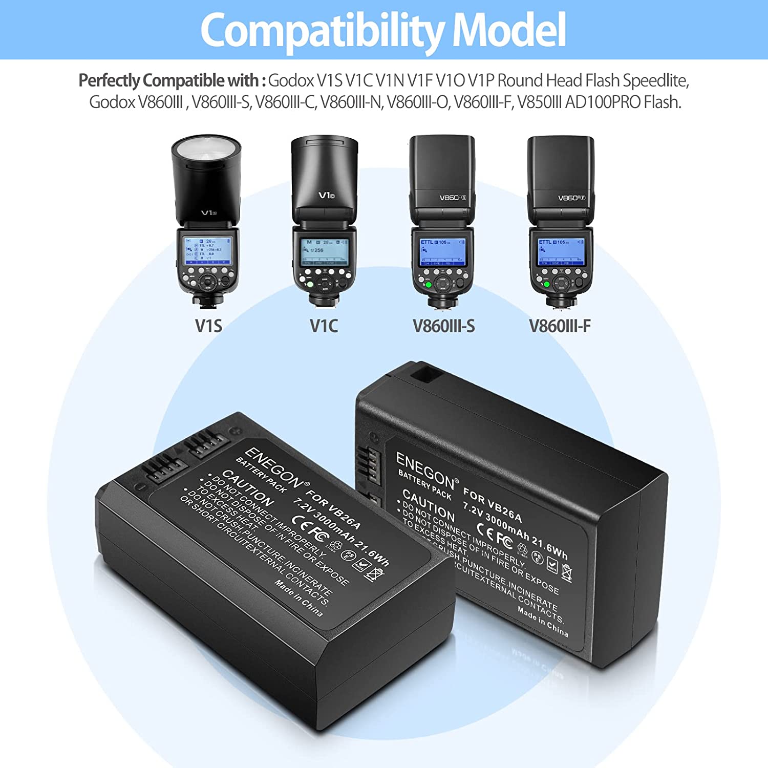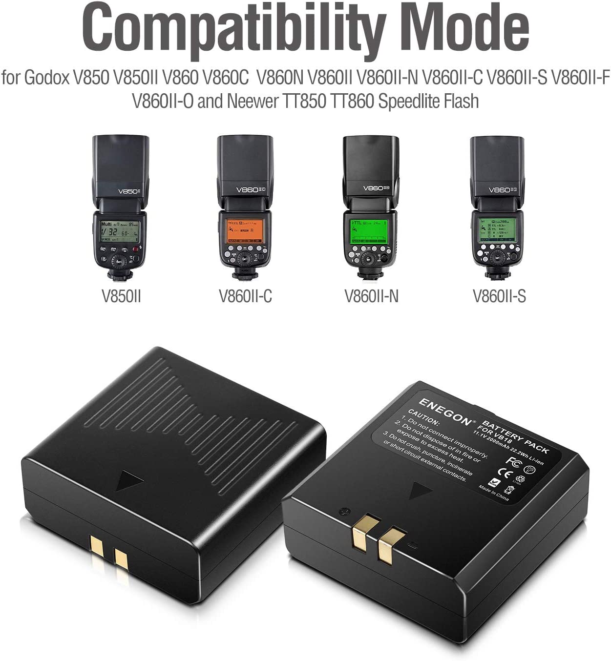 • Batteries VB18 (Rated at 11.1V, 2000mAh ) and Rapid Dual Charger are fully compatible with Godox V850 V850II V860 V860C V860N V860II V860II-N V860II-C V860II-S V860II-F V860II-O and Neewer TT850 TT860
